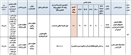 حكم 13- ايجاد پايانههاي حمل و نقل تركيبي و تقاطعگيري بين مدهاي حمل و نقلي (مترو، اتوبوس، تاكسي و ساير) براساس نتايج مطالعات تفصيلي حمل و نقل عمومي يكپارچه شهر تهران تا پايان برنامه