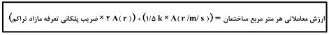 در اجراي تبصره يازدهم (11) ذيل ماده صد (100) قانون شهرداري الحاقي 1358/06/27 شوراي انقلاب مبني بر تهيه آئيننامه ارزش معاملاتي ساختمان كه بر اساس آن جريمههاي موضوع تبصرههاي دوم، سوم، چهارم و پنجم اين قانون از متخلفين اخذ مي شود، ارزش معاملاتي هر مترمربع ساختمان به شرح ذيل محاسبه و اعلام ميگردد: 1- ارزش معاملاتي هر مترمربع ساختمان با كاربرد مسكوني و خدماتي، بر مبناي دو برابر ارزش هر مترمربع مازاد تراكم پايه مالي با احتساب ضرايب پلكاني تعرفه مازاد تراكم و به صورت فرمول زير محاسبه و اخذ ميشود.
