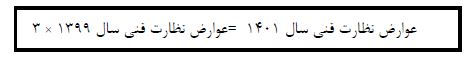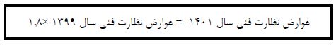 ![]() تبصره يكم (1): عوارض ملاك عمل در سال 1401 در بلوك a 12-14، بلوك 14-12 و تجاريهاي واقع در راسته يا پهنههاي m و s واقع در منطقه 12 به شرح زير محاسبه و ملاك عمل ميباشد: ![]() 2- نحوه محاسبه عوارض نظارت فني مطابق با ماده ششم (6) مصوبه "نحوه محاسبه و دريافت عوارض صدور پروانه ساختماني نظارت فني و عوارض استفاده موقت در شهر تهران" به شماره ابلاغي 160/2624/32265 مورخ 1398/11/14 براي سال 1401 در كليه مناطق مطابق فرمول زير ميباشد: