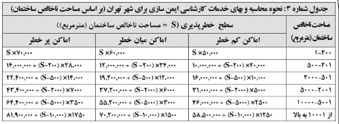 سرفصل سوم- نرخ بهاي خدمات تخصصي ايمني و پيشگيري از وقوع حريق: 3-1- نرخ بهاي خدمات كارشناسي ايمنسازي اماكن در شهر تهران ![]() تبصره دوم (2): هزينه كارشناسي بازديد و تهيه شناسنامه- تهيه دستورالعمل ايمني در تهران هر 5 (پنج) سال يكبار اخذ ميگردد. تبصره سوم (3): هزينه بازبيني و صدور گواهي ايمني در تهران سالانه يكبار دريافت ميگردد. تبصره چهارم (4): هزينه كارشناسي تهران بر اساس كل مساحت عيان طبق سند ملكي به ازاي هر متر مربع به صورت پلكاني (مطابق جدول شماره 3) محاسبه و اخذ ميگردد. تبصره پنجم (5): حداقل هزينه كارشناسي براي اماكن كم خطر برابر با 2,500,000 (دو ميليون و پانصد هزار) ريال، براي اماكن ميان خطر برابر با 3,000,000 (سه ميليون) ريال، و براي اماكن پر خطر برابر با 3,500,000 (سه ميليون و پانصد هزار) ريال ميباشد. تبصره ششم (6): تعيين ميزان خطرپذيري اماكن (كمخطر، ميانخطر، پرخطر) بسته به نوع كاربري، تراز ارتفاعي و محتويات مطابق با شاخصهاي ارزيابي خطرپذيري سازمان آتشنشاني و خدمات ايمني تهران ميباشد. تبصره هفتم (7): هزينه فضاي باز فاقد كاربري با تأييد كارشناس سازمان آتشنشاني و خدمات ايمني تهران 50% (پنجاه درصد) ارقام محاسبات جدول شماره 3 ميباشد. تبصره هشتم (8): هزينه تهيه شناسنامه ايمني معادل 20% (بيست درصد) و هزينه بازبيني (صدور تأييديه) معادل 40% (چهل درصد) كل هزينه تهيه دستورالعمل محاسبه ميگردد. تبصره نهم (9): در صورت اضافه متراژ در زمان تسويه حساب، كل متراژ قبلي و متراژ نهايي با نرخ جديد محاسبه و اختلاف آن جهت تسويه اضافه متراژ اخذ خواهد گرديد. 3 -2- نرخ بهاي خدمات كارشناسي ايمنسازي اماكن در تهران و شهرستانها