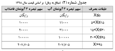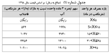 مبالغ وصولي از محل تبصره سوم (3) ماده واحده قانون ايجاد تسهيلات براي توسعه طرحهاي فاضلاب و بازسازي شبكههاي آب شهري مصوب 1377/3/24 مجلس شوراي اسلامي كه در اين مصوبه اختصاراً (سهم تبصره 3) ناميده ميشود به شرح ذيل مي باشد: الف) از كليه مشتركين آب و فاضلاب در بخش خانگي مبالغي به شرح ارقام مندرج در جدول شماره (1) به تناسب ميزان آب مصرفي ماهانه هر واحد به عنوان سهم تبصره (3) دريافت گردد: