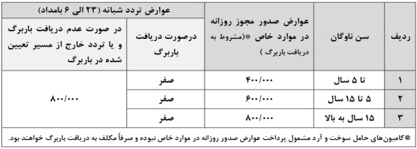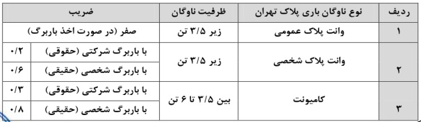 ![]() تعيين عوارض تردد جهت مديريت ترافيك و كاهش تقاضاي سفر در سال 1402 ماده واحده: نظر به مفاد ماده هجدهم (18) «قانون رسيدگي به تخلفات رانندگي» مصوب 1389 و ماده هفتم (7) «قانون هواي پاك» مصوب 1396 مجلس شوراي اسلامي و در اجراي تبصره دوم (2) ماده سوم (3) «آييننامه اجرايي ماده هفتم قانون هواي پاك» مصوب 1397 هيات وزيران و بند شانزدهم (16) ماده هشتادم (80) «قانون تشكيلات، وظايف و انتخابات شوراهاي اسلامي كشور و انتخاب شهرداران» مصوب 1375 با اصلاحات و الحاقات بعدي و تبصره يكم (1) ماده پنجاهم (50) «قانون ماليات بر ارزش افزوده» مصوب 1387و همچنين بند (الف) تبصره يكم (1) ذيل ماده دوم (2)، ماده سوم و تبصره سوم (3) ذيل ماده ششم (6) «قانون درآمد پايدار و هزينه شهرداريها و دهياريها» مصوب 1401/04/01 و ماده بيست و چهارم (24) دستورالعمل اجرايي تبصره يكم (1) ماده دوم (2) قانون مزبور ابلاغي به شماره 203726 مورخ 1401/09/30 وزير محترم كشور و مصوبات شوراي حمل و نقل و ترافيك شهر تهران نظير مصوبات شماره (39)، (48) و (50)، شهرداري تهران مكلف است از ابتداي سال 1402 بر اساس مفاد مصوبات «تعيين عوارض تردد جهت مديريت ترافيك، كاهش تقاضاي سفر و كنترل آلودگي هوا در سال 1399» ابلاغي به شماره 160/2623/32231 مورخ 1398/11/14 و اصلاحات بعدي آن، «تعيين عوارض تردد جهت مديريت ترافيك، كاهش تقاضاي سفر و كنترل آلودگي هوا در سال 1400» مصوب 1399/11/12 و «تعيين عوارض تردد جهت مديريت ترافيك، كاهش تقاضاي سفر و كنترل آلودگي هوا در سال 1401» ابلاغي به شماره 160/2905/22660 مورخ 1400/11/10 و اصلاحيه آن به شماره 160/2905/1/22892 ( ![]() شماره ابلاغ مذکور متعلق به نامه اصلاحی مصوبه «تعيين عوارض تردد جهت مديريت ترافيك، كاهش تقاضاي سفر و كنترل آلودگي هوا در سال 1401» به شماره ابلاغ 160/2905/22660 است و در تصاویر آن مصوبه قابل مشاهده میباشد. الف) نرخ پايه عوارض مذكور در صدر ماده يكم (1) مصوبه «تعيين عوارض تردد جهت مديريت ترافيك، كاهش تقاضاي سفر و كنترل آلودگي هوا در سال 1399» ابلاغي به شماره 160/2623/32231 مورخ 1398/11/14 با آخرين اصلاحات صورت گرفته در سالهاي 1399 و 1400، با اعمال بيست درصد (20%) افزايش نسبت به نرخ مصوب سال 1401 به ميزان پانصد و بيست و پنج هزار و ششصد (525/600) ريال تعيين و متن ماده يكم (1) مصوبه مزبور به شرح زير اصلاح و جايگزين ميشود: ماده يكم (1) اصلاحي: ورود يا تردد وسايل نقليه به محدودههاي طرح ترافيك و كنترل آلودگي هوا (مطابق مصوبه شماره (54) شوراي حمل و نقل و ترافيك شهر تهران) منوط به پرداخت عوارض و اخذ مجوز تردد موضوع اين ماده است. عوارض تردد وسايل نقليه مجاز (وفق تعريف تبصره يكم (1) ماده يكم (1) مصوبه) در هر يك از محدودههاي فوقالذكر در هر روز برابر است با حاصل ضرب نرخ پايه عوارض به مبلغ پانصد و بيست و پنج هزار و ششصد (525/600) ريال (با احتساب بيست (20%) درصد عوارض توسعه حمل و نقل ريلي) در ضريب مربوط به محدوده تردد (جدول شماره يك (1))، ضريب مربوط به ساعت تردد (جدول شماره دو (2))، ضريب مربوط به آلايندگي وسيله نقليه (جدول شماره (3)). همچنين عوارض تردد وسايل نقليهاي كه به صورت غيرمجاز در محدودههاي ممنوعهي تردد موضوع اين ماده تردد مينمايند در صورت تكميل نبودن ظرفيت سقف مجاز تردد روزانه، مطابق حداكثر ضرايب پيشبيني شده وفق جداول ذيل محاسبه خواهد شد. ب) بهاي خدمات مذكور در تبصره پنجم (5) ماده يكم (1) مصوبه «تعيين عوارض تردد جهت مديريت ترافيك، كاهش تقاضاي سفر و كنترل آلودگي هوا در سال 1399» ابلاغي به شماره 160/2623/32231 مورخ 1398/11/14 با آخرين اصلاحات صورت گرفته در سالهاي 1399 و 1400، با اعمال بيست درصد (20%) افزايش نسبت به نرخ مصوب سال 1401 به ميزان دو ميليون و هشتصد و دوازده هزار و هشتصد (2/812/800 ) ريال تعيين و متن تبصرهي مذكور به شرح زير اصلاح ميشود: تبصره پنجم (5) اصلاحي: به ازاي صدور مجوز ساليانه تردد در محدوده طرح ترافيك در كل سال، فقط براي يكبار و براي هر خودرو به ميزان دو ميليون و هشتصد و دوازده هزار و هشتصد (2/812/800) ريال بابت بهاي خدمات اخذ ميگردد. پ) جدول شماره پنج (5) ذيل ماده هفتم (7) مصوبه «عوارض تردد جهت مديريت ت