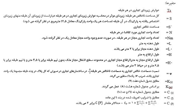 تبصره هشتم (8): در صورتي كه بر اساس مصوبات موردي كميسيون ماده پنج قانون تأسيس شوراي عالي شهرسازي و معماري ايران، تراكم ساختماني نسبت به دفترچه ضوابط و مقررات آخرين طرح تفصيلي مصوب افزايش يابد، ضريب پلكاني عوارض زيربنا، براي مازاد تراكم مسكوني اختصاص يافته بر مبناي دو (2) (( ![]() ) به موجب نامه اصلاحي شماره 160/3052/24145 به تاريخ 1401/11/26 عبارت مذكور در سند تصويب بدين شرح اصلاح شد. تبصره نهم (9): عوارض زيربناي مسكوني درخصوص پروندههاي داراي مصوبات موردي كميسيون ماده پنج قانون تأسيس شوراي عالي شهرسازي و معماري ايران، برابر با مجموع عوارض تبصرههاي (7) و (8) موضوع اين ماده ميباشد. تبصره دهم (10): در پروانههاي توسعه بنا، اضافه اشكوب، تغييرات، تبديل، تغيير نقشه، شروع عمليات ساختماني پس از محاسبه عوارض متعلقه، عوارض بناي مجاز طبق آخرين پروانه/گواهي قبلي به نرخ روز محاسبه و از عوارض ياد شده كسر گردد. تبصره يازدهم (11): عوارض زيربنا مسكوني براي كليه تعاونيهاي مسكن مورد تأئيد وزارت تعاون، كار و رفاه و امور اجتماعي، با ضريب هشتاد درصد (80%) محاسبه ميگردد. تبصره دوازدهم (12): در املاكي كه با استفاده از سازوكار انتقال حق توسعه (منوط به تصويب كميسيون ماده پنج قانون تأسيس شوراي عالي شهرسازي و معماري ايران)، تراكم مازاد بر جداول پهنهبندي دريافت ميكنند، مبناي محاسبه عوارضِ تراكم انتقال يافته جدول شماره سه ميباشد. 2- عوارض زيربناي غيرمسكوني الف) عوارض زيربناي تجاري: عوارض زيربناي تجاري در هر طبقه براساس فرمول ذيل محاسبه ميگردد: ![]() ![]()