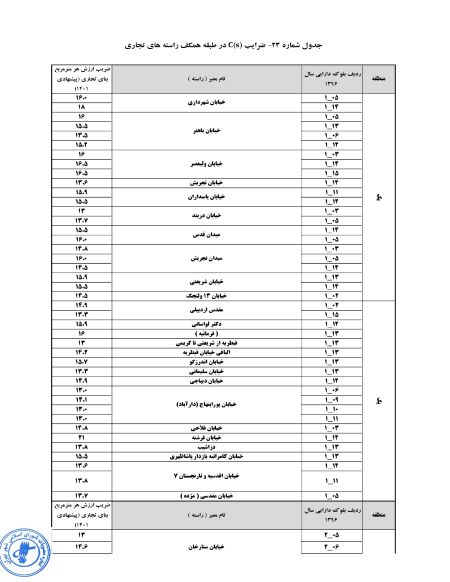 در محدوده بازار تهران ارزش معاملاتي عرصه املاك با كاربري تجاري مطابق با آخرين دفترچه ارزش معاملاتي ملاك عمل موضوع ماده 64 قانون مالياتهاي مستقيم با احتساب ضرايب احتمالي تعديل اعلامي توسط هيأت وزيران براي هر سال و ضريب عرض گذر مطابق با حداكثر عرض گذر اعلامي وفق تبصره ذيل بند 3 بخش اول ضوابط اجرايي ارزش معاملاتي املاك شهر تهران. تبصره دوم (2):