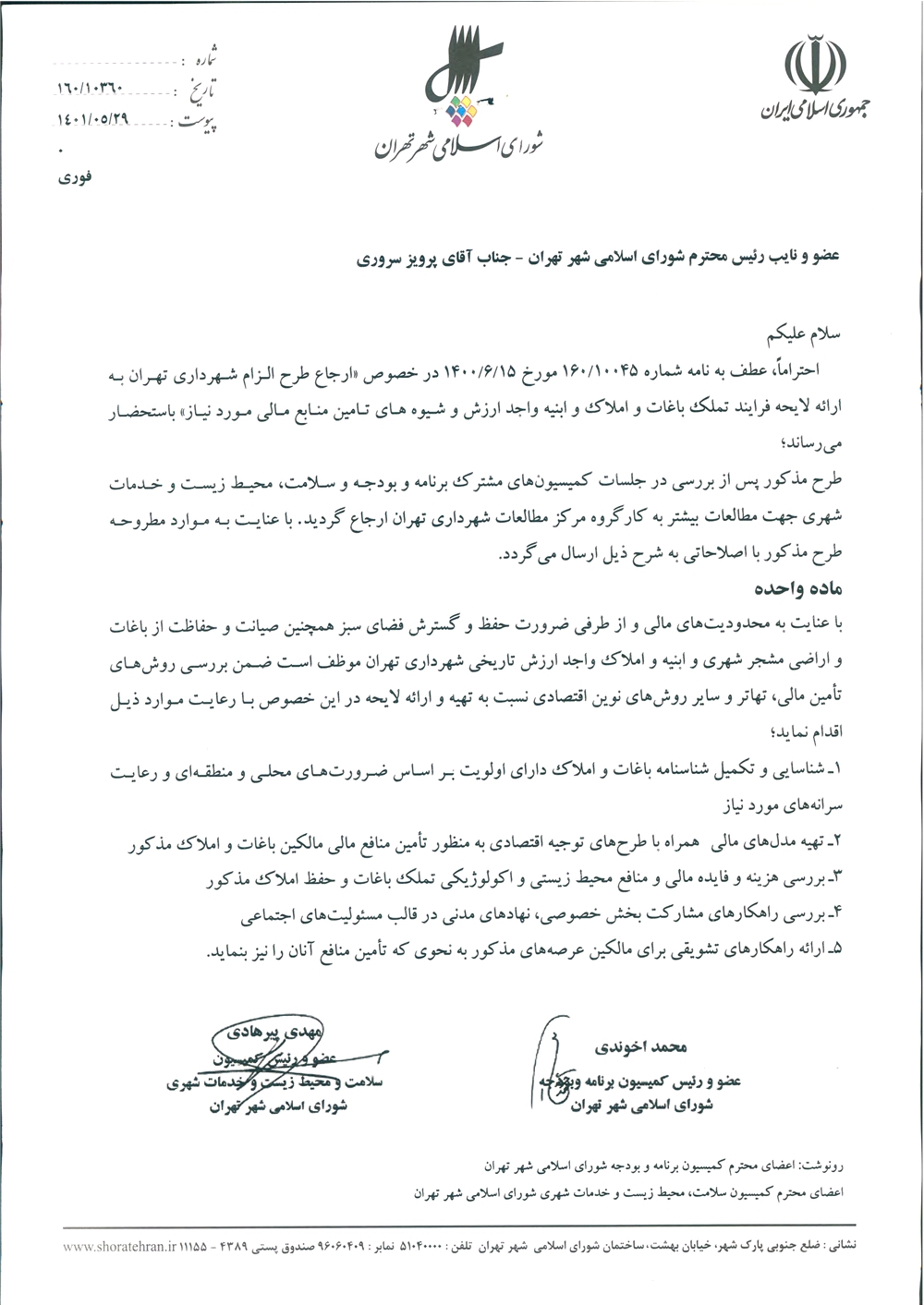 الزام شهرداري تهران به ارائه لايحه فرايند تملك باغات و املاك و ابنيه واجد ارزش و شيوه هاي تأمين منابع مالي مورد نياز