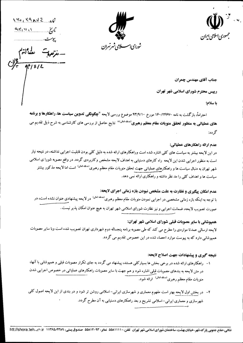 چگونگي تدوين سياستها و راهكارهاي عملياتي به منظور تحقق منويات مقام معظم رهبري (مد ظله العالي) ابلاغي در ديدار با اعضاي شوراي اسلامي شهر تهران، شهردار تهران و مديران شهرداري تهران در تاريخ 92/9/23 با ايشان