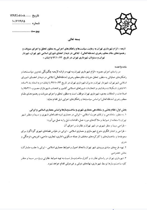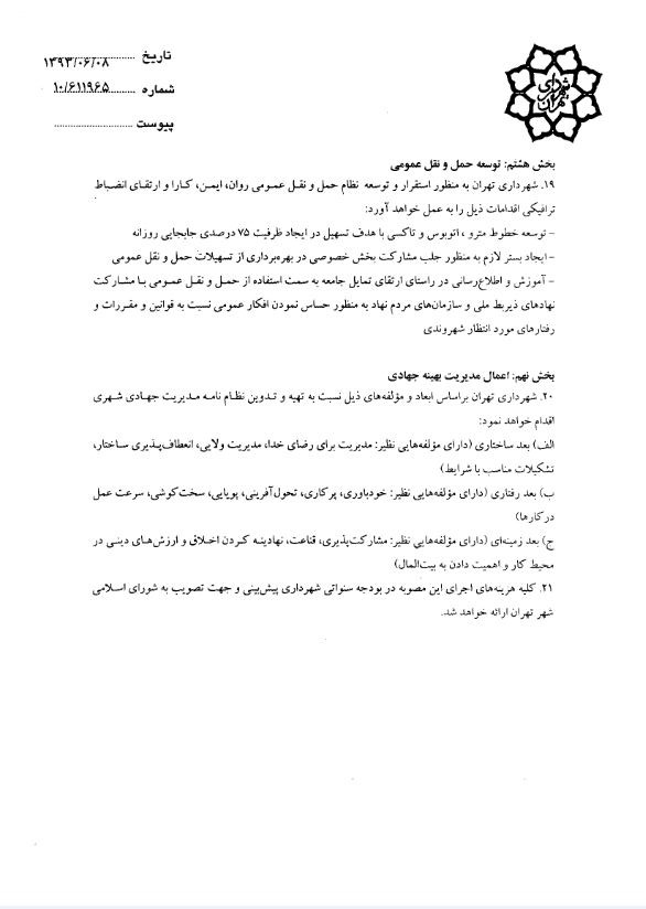 چگونگي تدوين سياستها و راهكارهاي عملياتي به منظور تحقق منويات مقام معظم رهبري (مد ظله العالي) ابلاغي در ديدار با اعضاي شوراي اسلامي شهر تهران، شهردار تهران و مديران شهرداري تهران در تاريخ 92/9/23 با ايشان