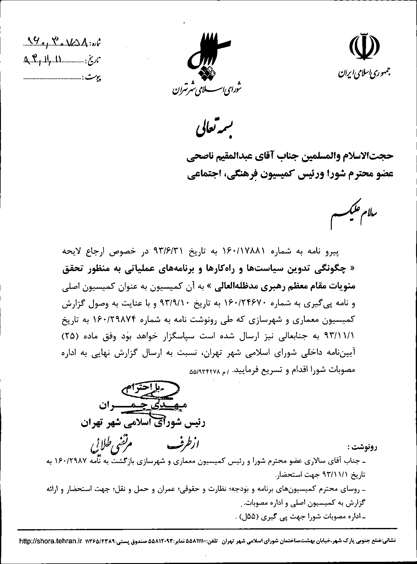 چگونگي تدوين سياستها و راهكارهاي عملياتي به منظور تحقق منويات مقام معظم رهبري (مد ظله العالي) ابلاغي در ديدار با اعضاي شوراي اسلامي شهر تهران، شهردار تهران و مديران شهرداري تهران در تاريخ 92/9/23 با ايشان