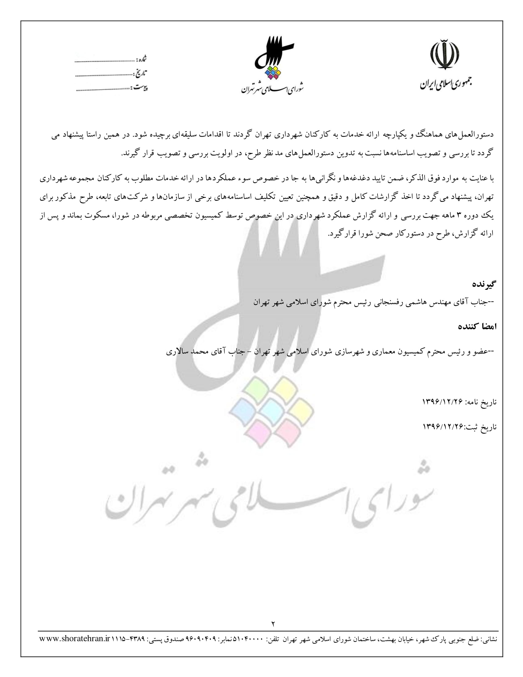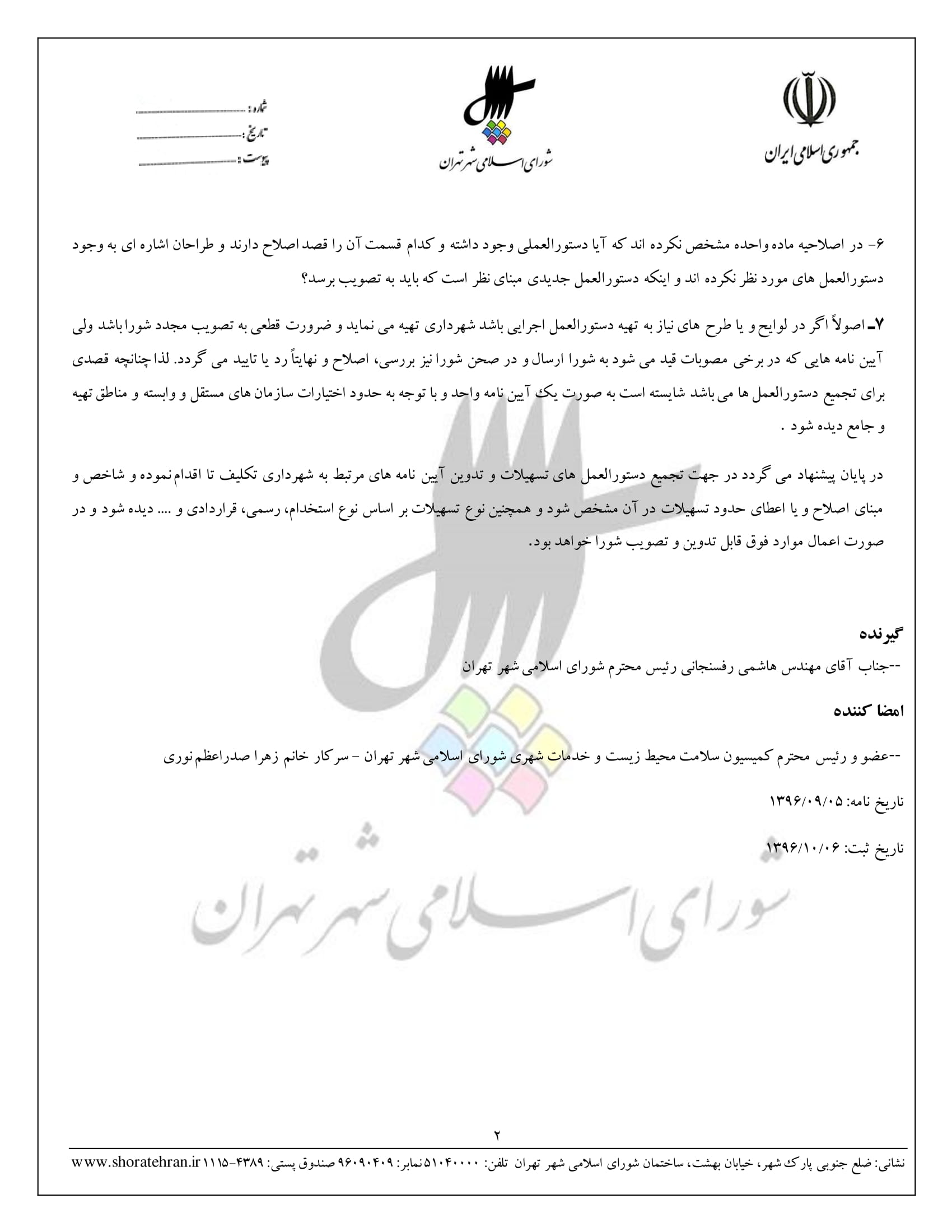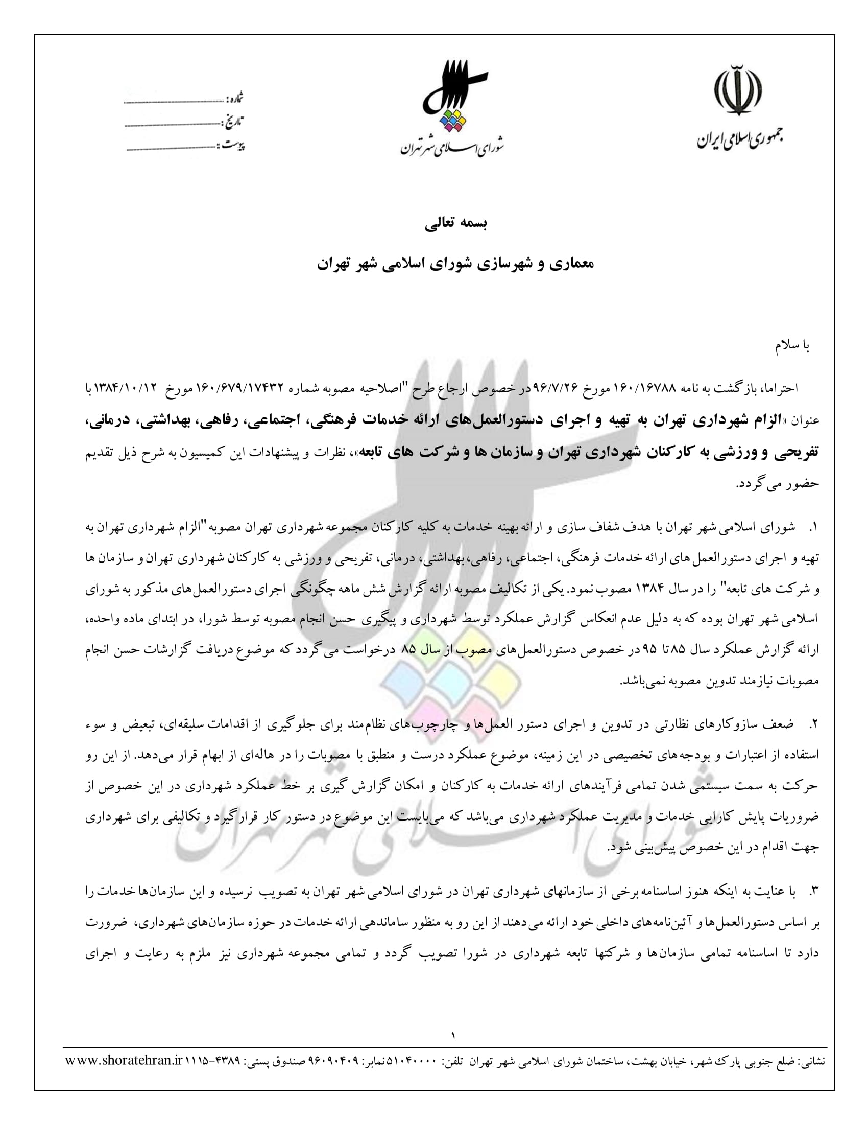 اصلاحيه مصوبه شماره 160/679/17432 مورخ 1384/10/12 با عنوان "الزام شهرداري تهران به تهيه و اجراي دستورالعملهاي ارائه خدمات فرهنگي، اجتماعي، رفاهي، بهداشتي، درماني، تفريحي و ورزشي به كاركنان شهرداري تهران و سازمانها و شركتهاي تابعه"