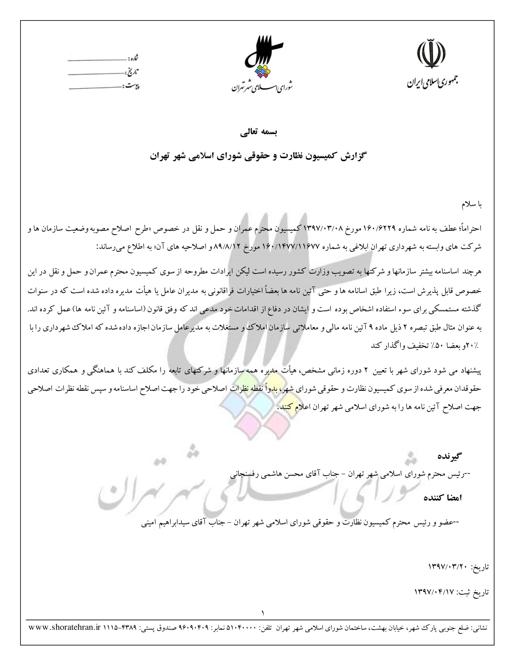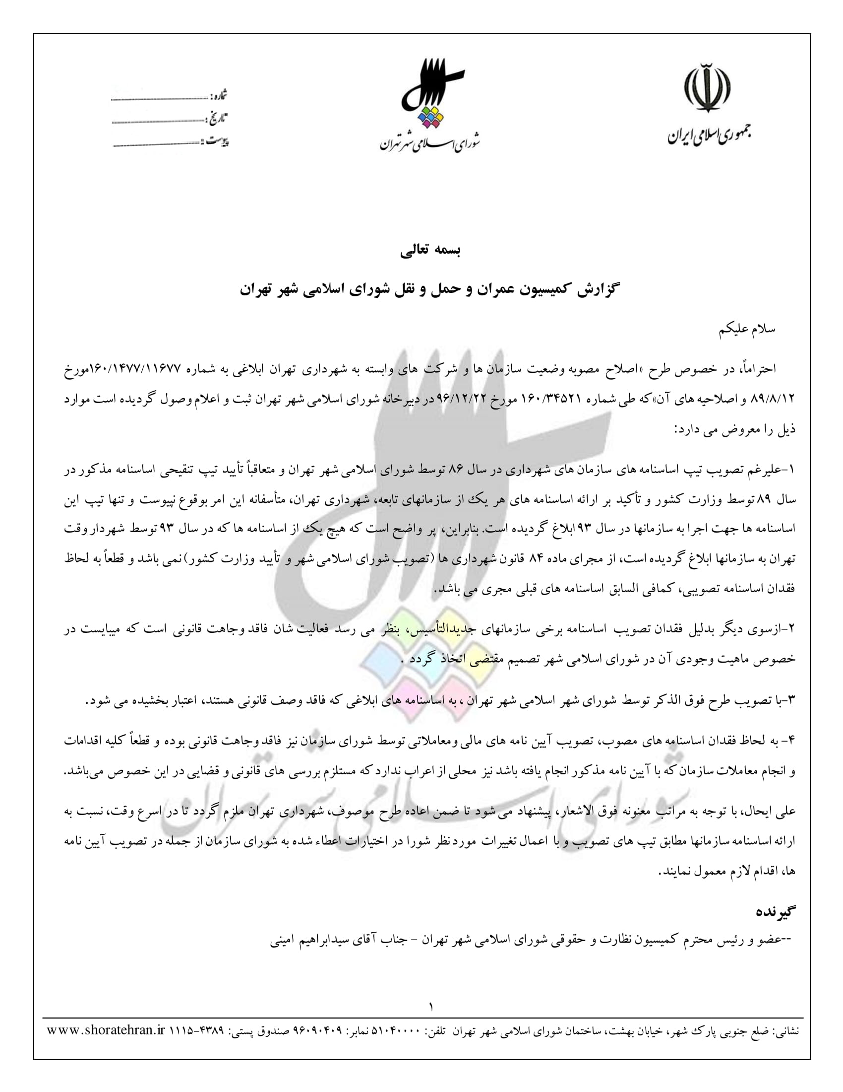 اصلاح مصوبه ساماندهي وضعيت سازمانها و شركتهاي وابسته به شهرداري تهران-ابلاغي به شماره 160/1477/11677 مورخ 1389/08/12 و اصلاحيههاي آن