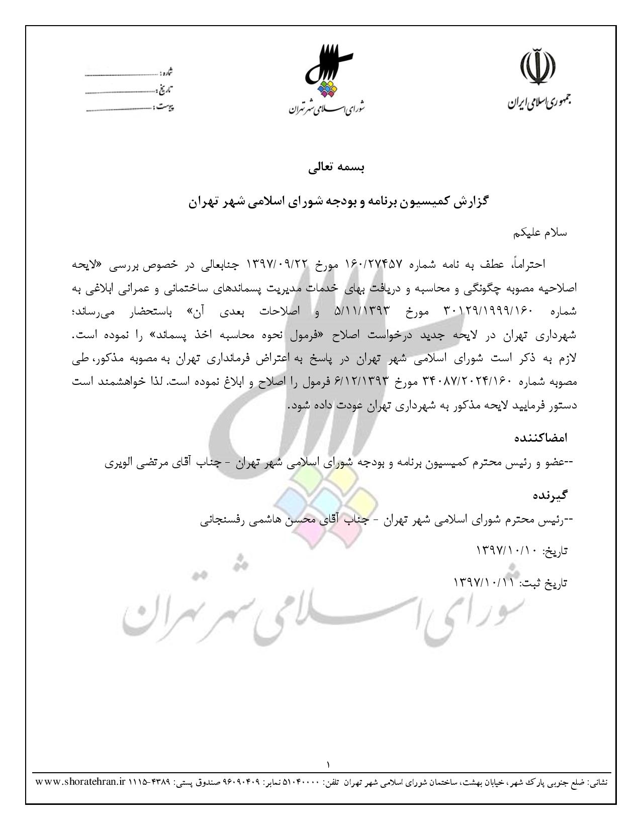اصلاحيه مصوبه چگونگي محاسبه و دريافت بهاي خدمات مديريت پسماندهاي ساختماني و عمراني ابلاغي به شماره 160/1999/30129 - مورخ 1393/11/5 و اصلاحات بعدي آن