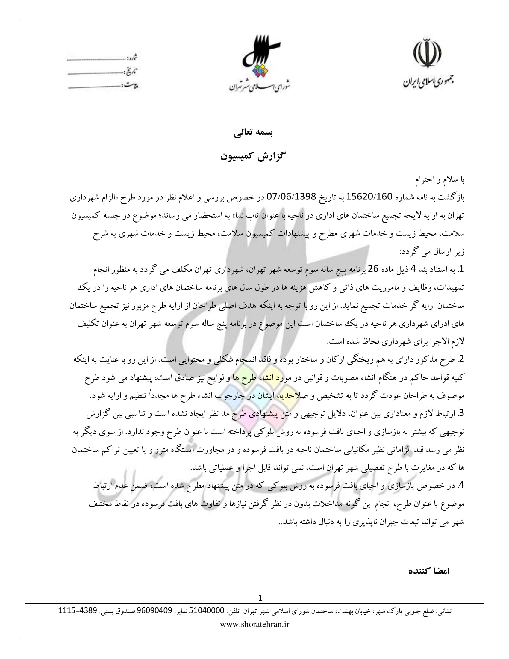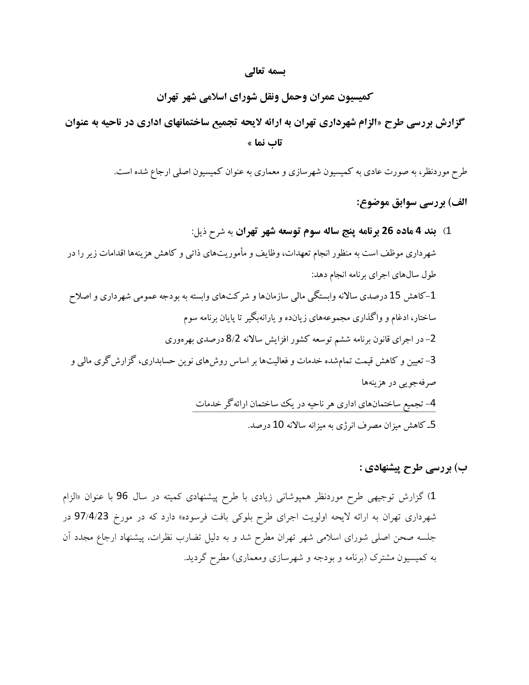 الزام شهرداري تهران به ارائه لايحه تجميع ساختمانهاي اداري در ناحيه با عنوان تابنما