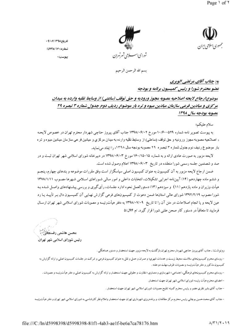 اصلاحيه مصوبه مجوز وروديه و حق توقف (ساعتي) از وسايط نقليه وارده به ميدان مركزي و ميادين فرعي سازمان ميادين ميوه و تره‌بار و فرآورده‌هاي كشاورزي شهر تهران ابلاغي به شماره 160/680/17430 مورخ 1384/10/12 و اصلاحات و الحاقات بعدي موضوع رديف (2) جدول شماره (3) تبصره (29) مصوبه بودجه سال 1398 شهرداري تهران