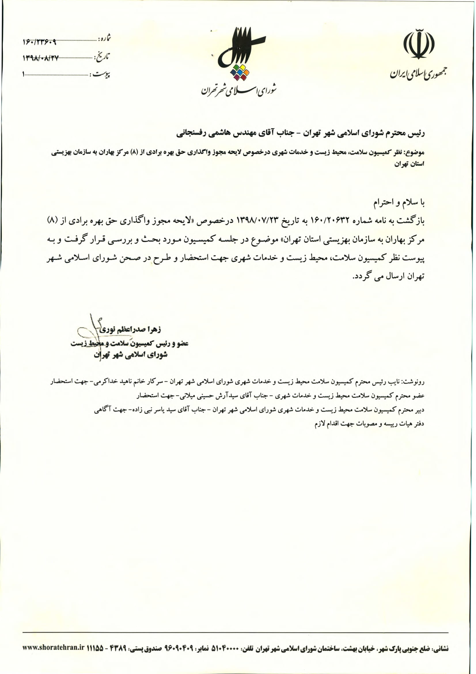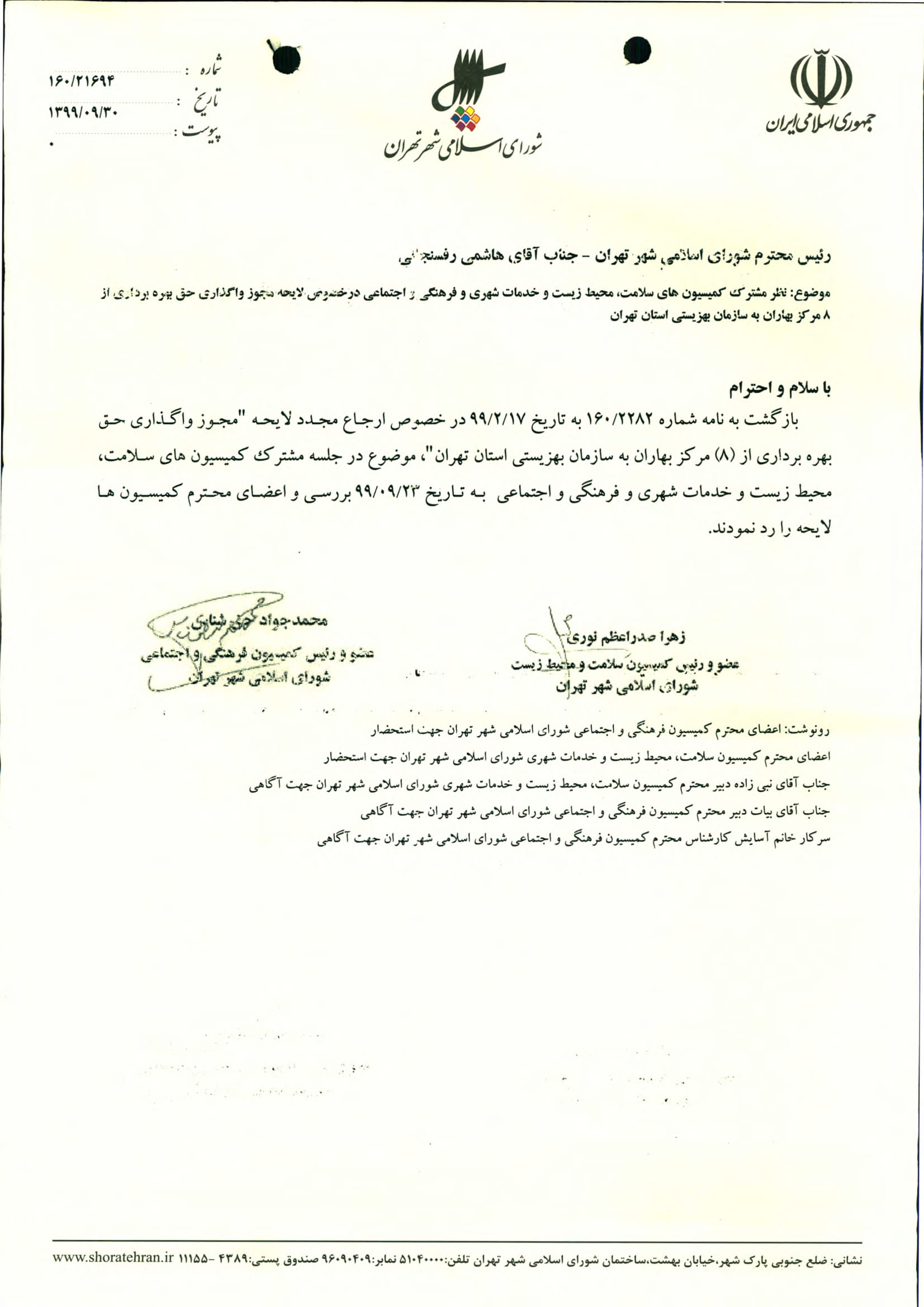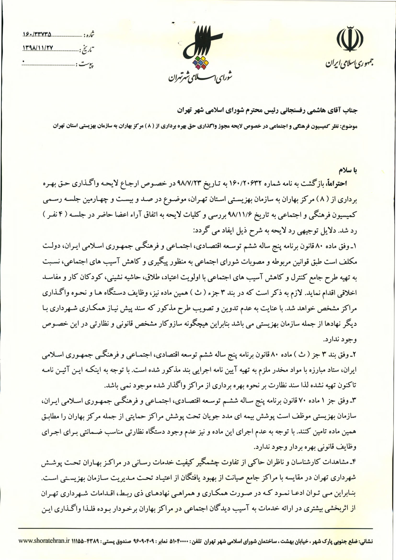 مجوز واگذاري حق بهرهبرداري از (8) مركز بهاران به سازمان بهزيستي استان تهران
