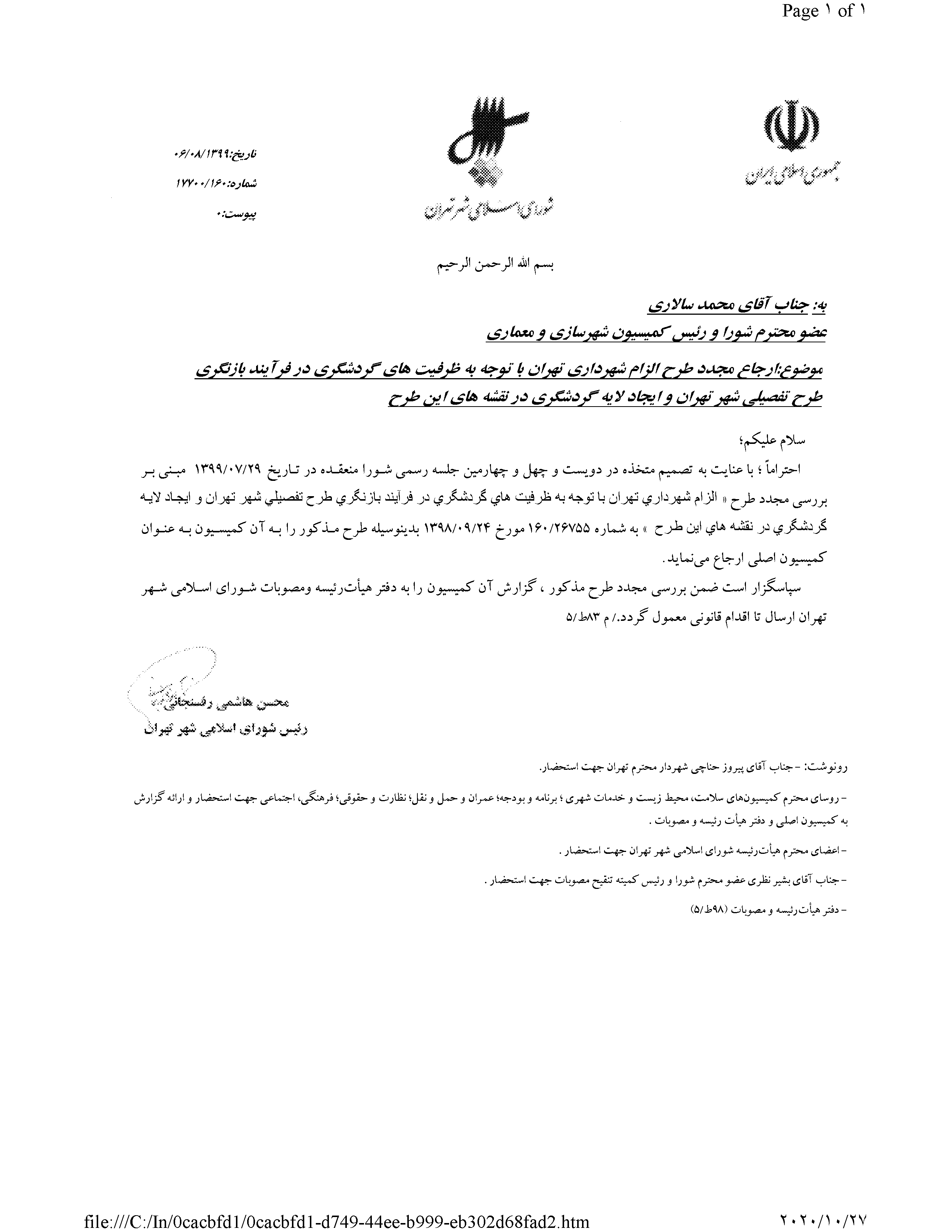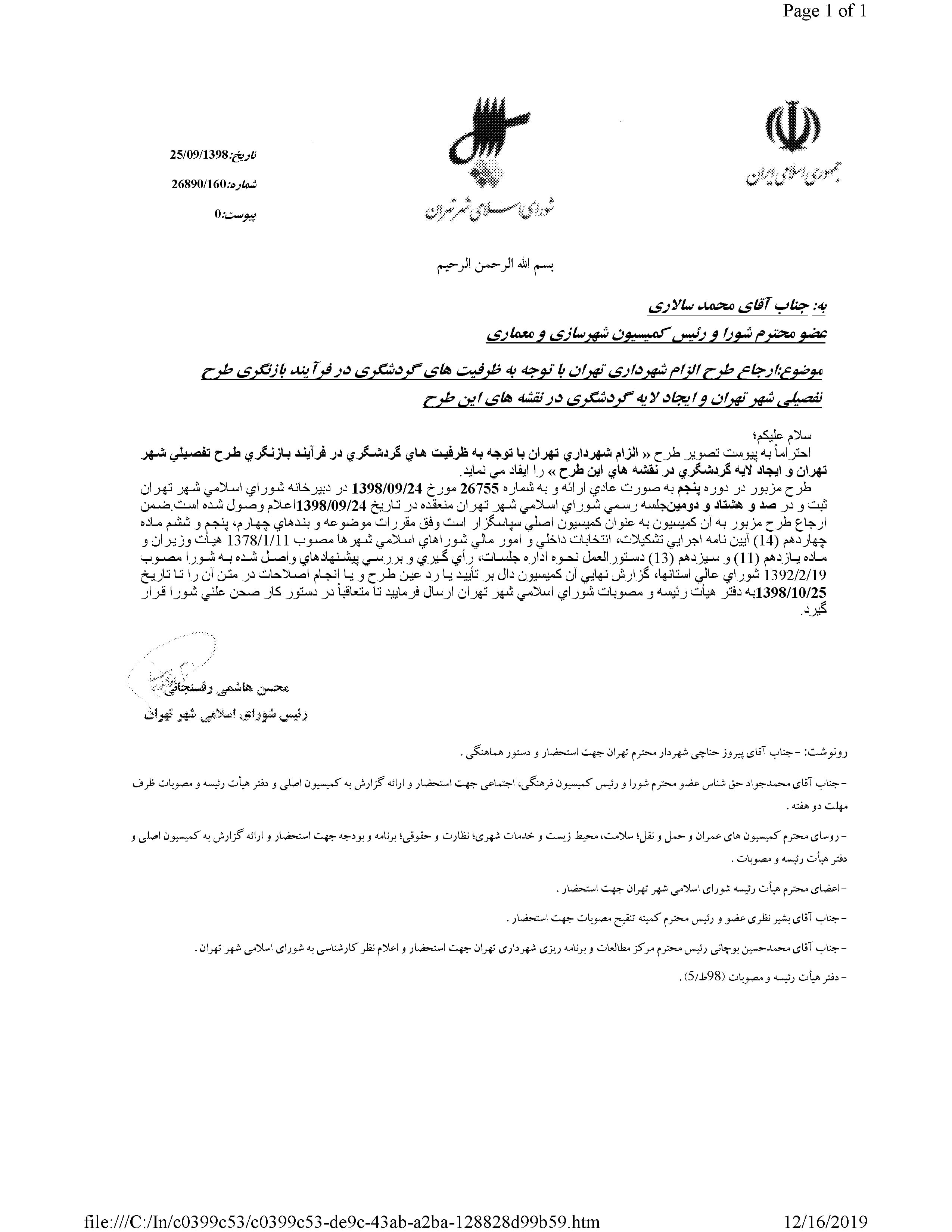 الزام شهرداري تهران با توجه به ظرفيت‌هاي گردشگري در فرآيند بازنگري طرح تفصيلي شهر تهران و ايجاد لايه گردشگري در نقشه‌هاي اين طرح