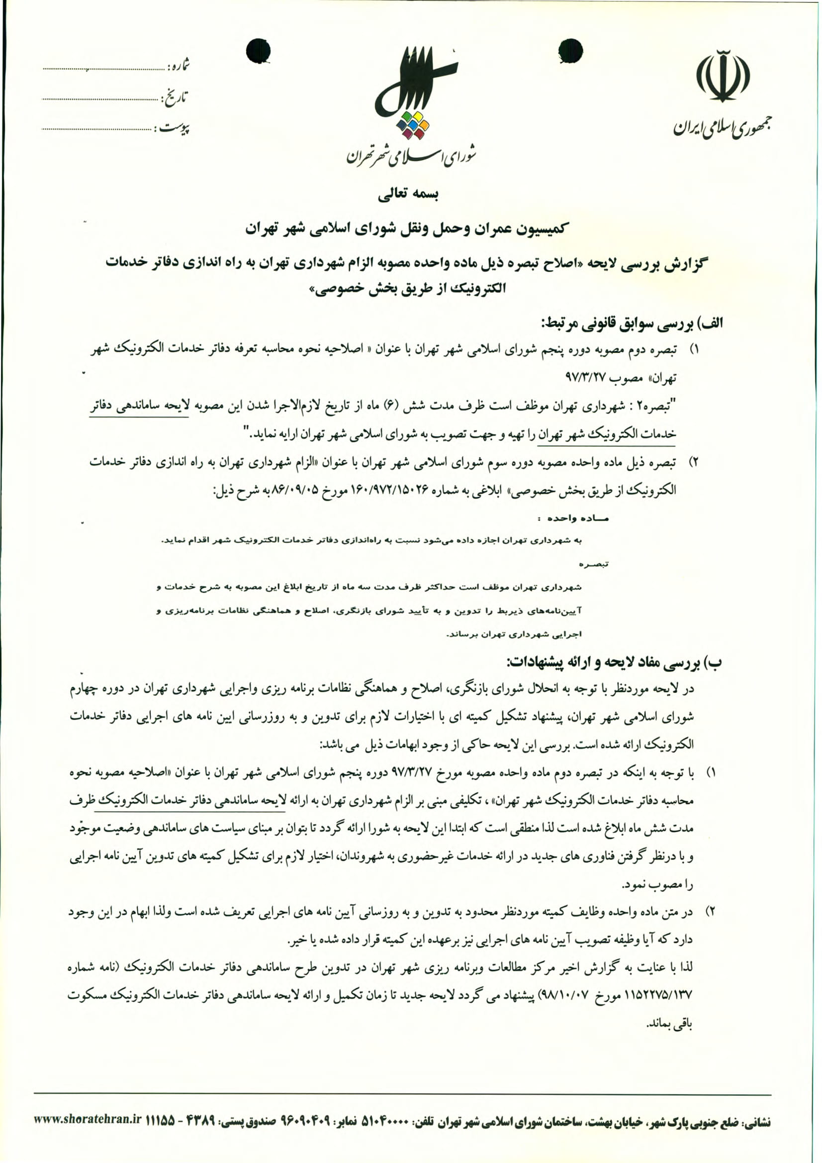 اصلاح تبصره ذيل ماده واحده مصوبه الزام شهرداري تهران به راهاندازي دفاتر خدمات الكترونيك از طريق بخش خصوصي