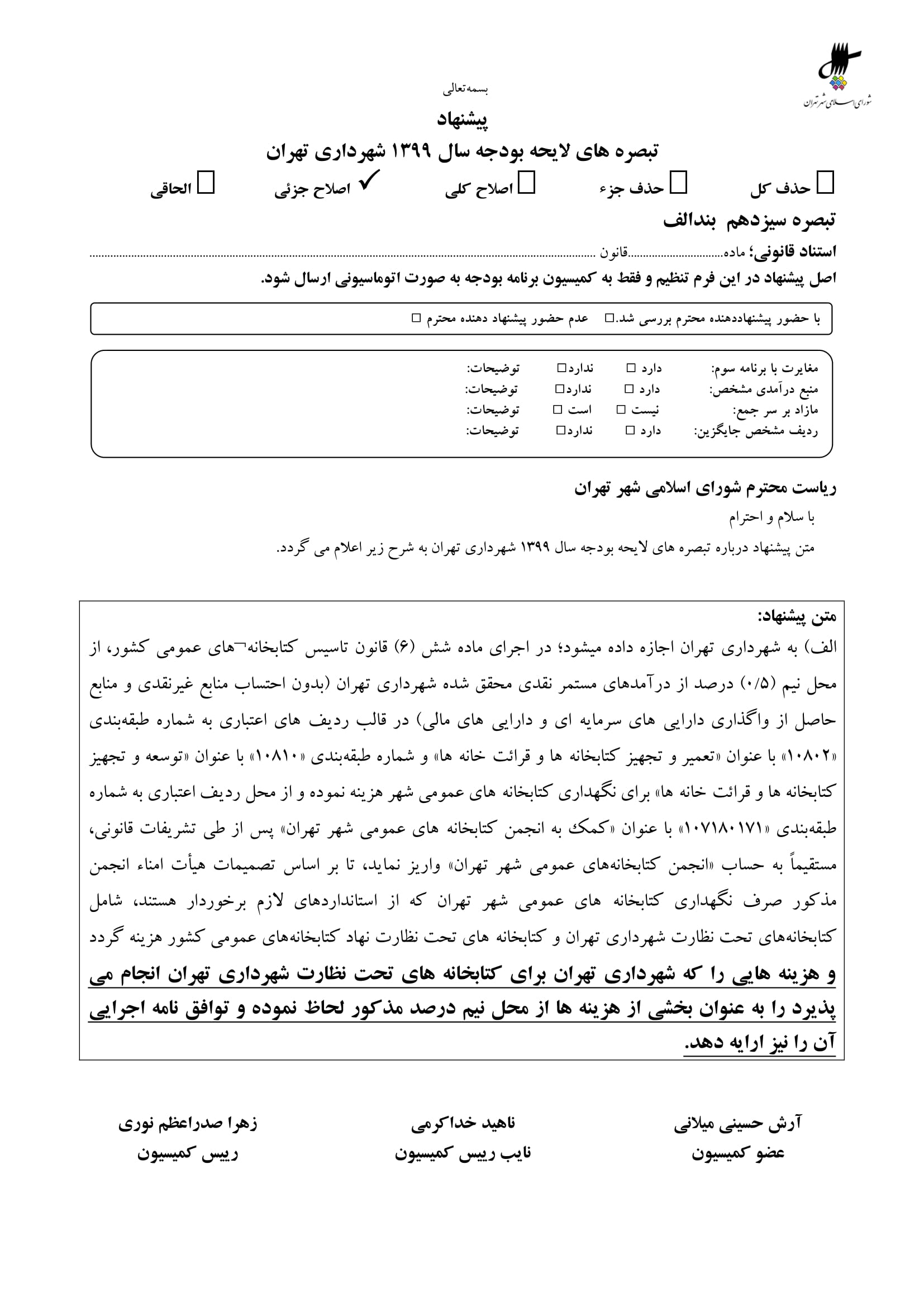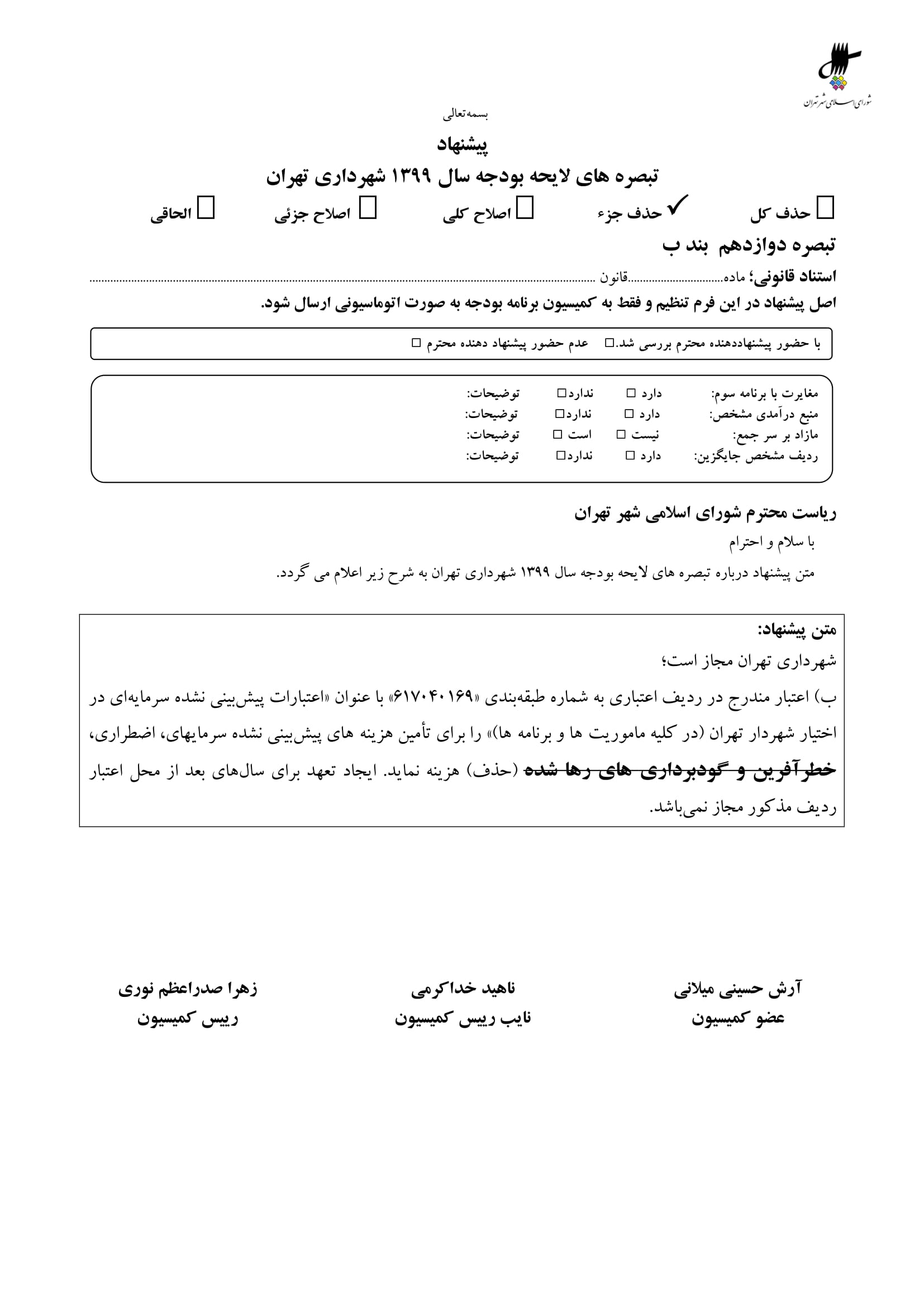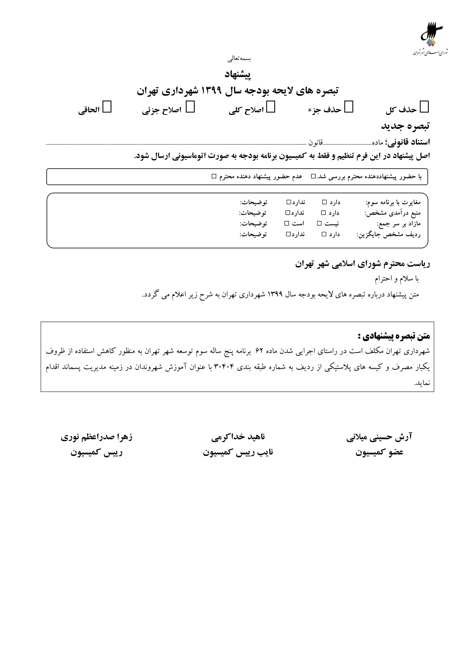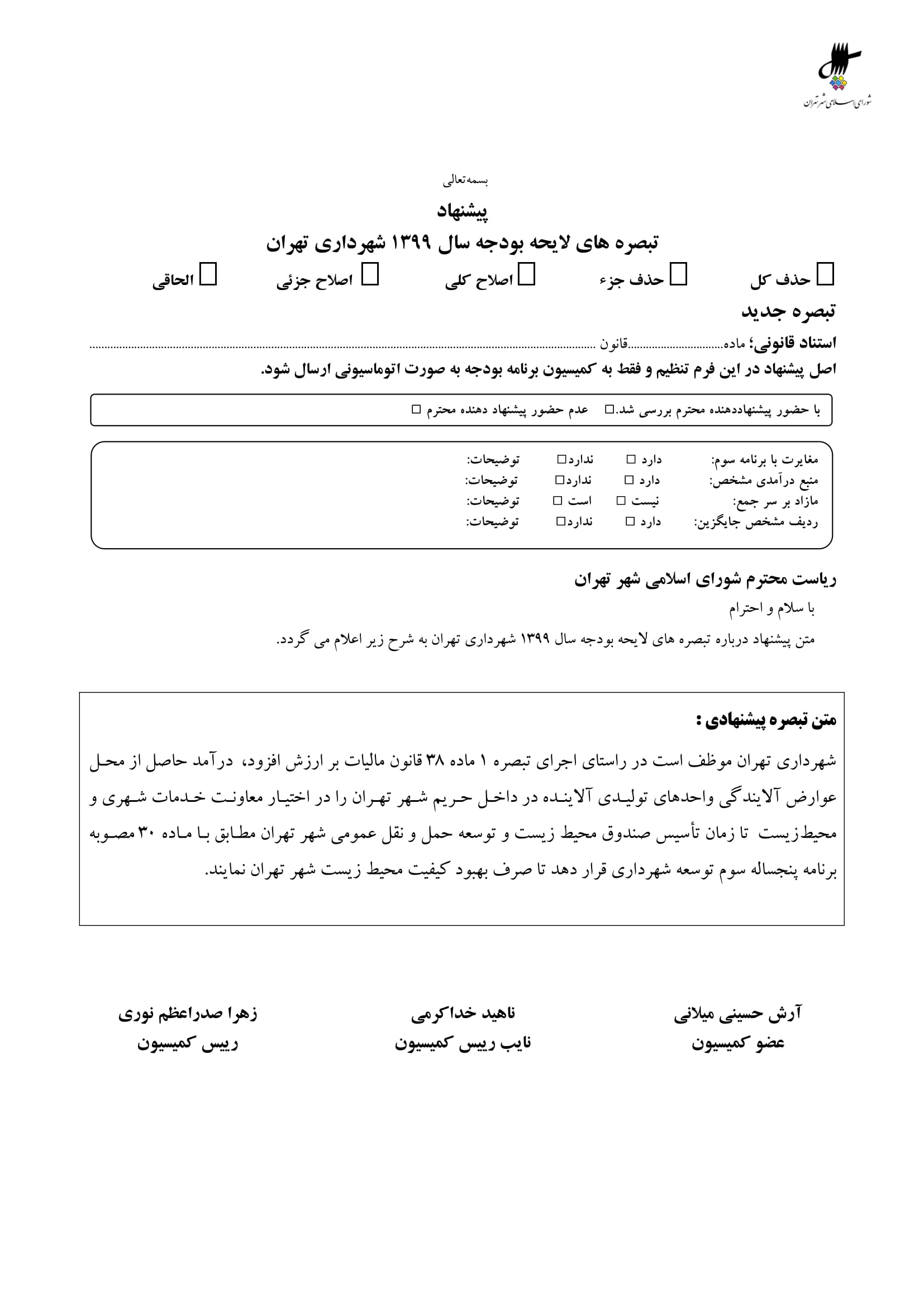 بودجه پيشنهادي سال 1399 شهرداري تهران