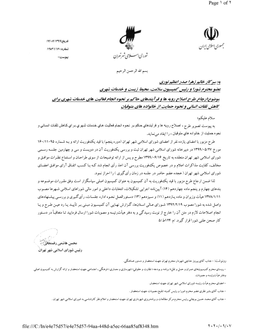 اصلاح رويهها و فرايندهاي حاكم بر نحوه انجام فعاليتهاي خدمات شهري براي كاهش تلفات انساني و نحوه حمايت از خانوادههاي متوفيان