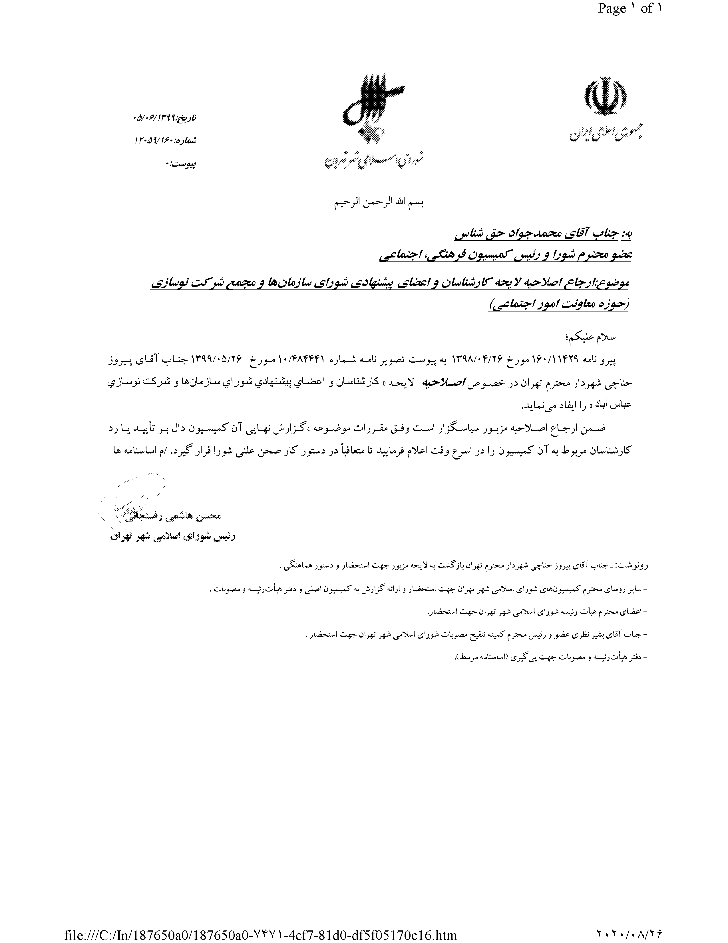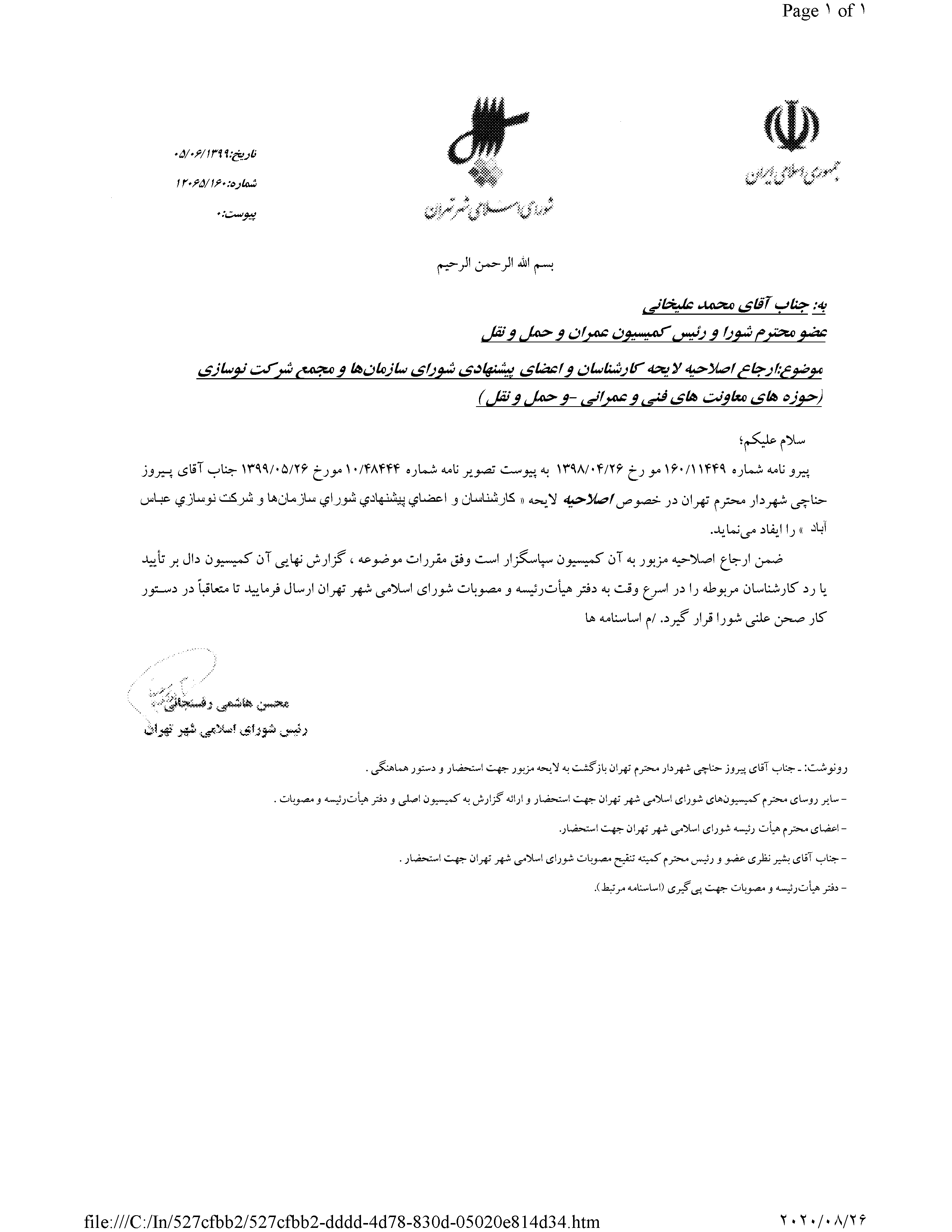 اصلاحيه لايحه «كارشناسان و اعضاي پيشنهادي شوراي سازمانها و شركت نوسازي عباسآباد»