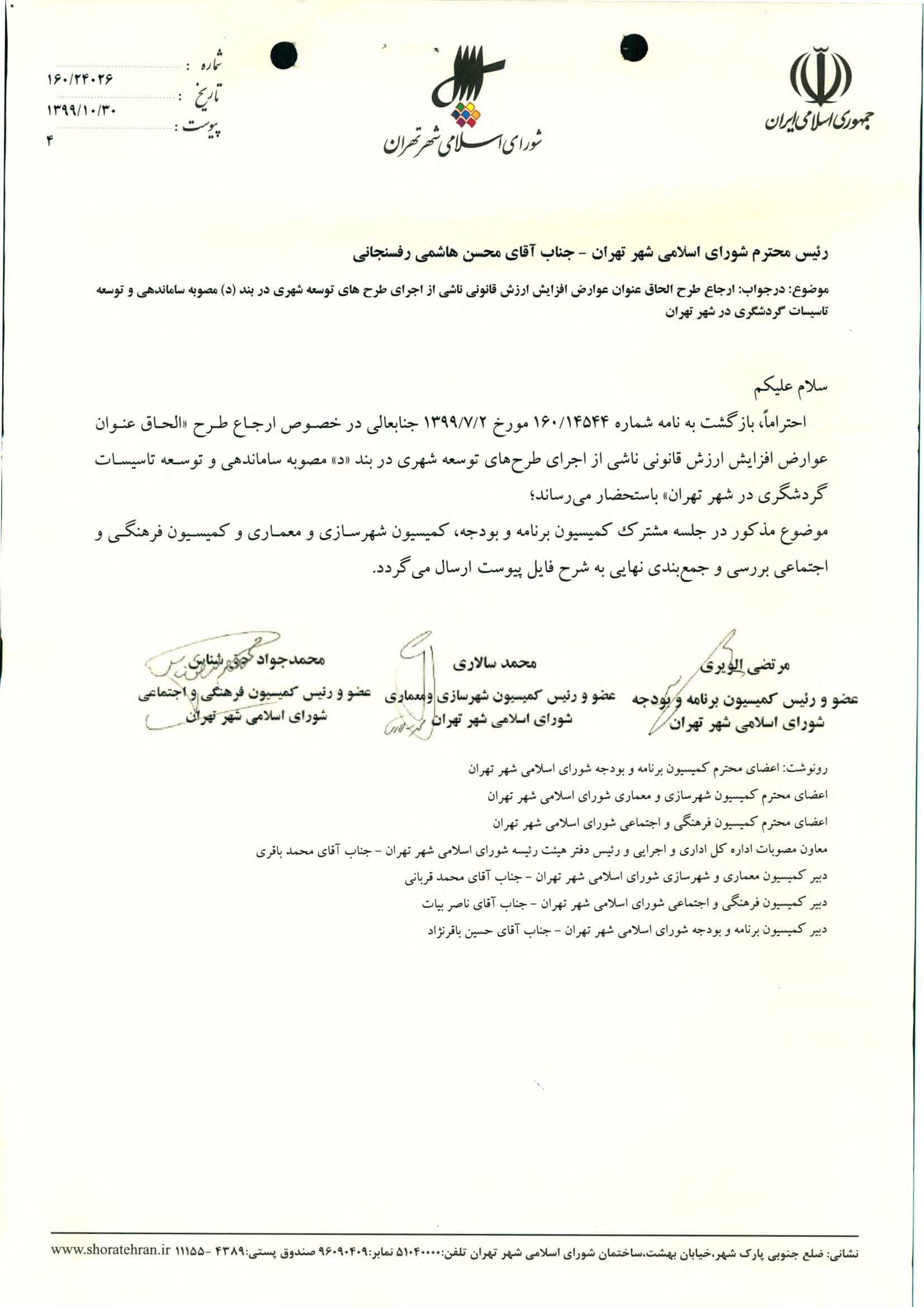 الحاق عنوان عوارض افزايش ارزش قانوني ناشي از اجراي طرحهاي توسعه شهري در بند "د" مصوبه «ساماندهي و توسعه تأسيسات گردشگري در شهر تهران» ابلاغي به شماره 160/907/7335 مورخ 1386/5/1