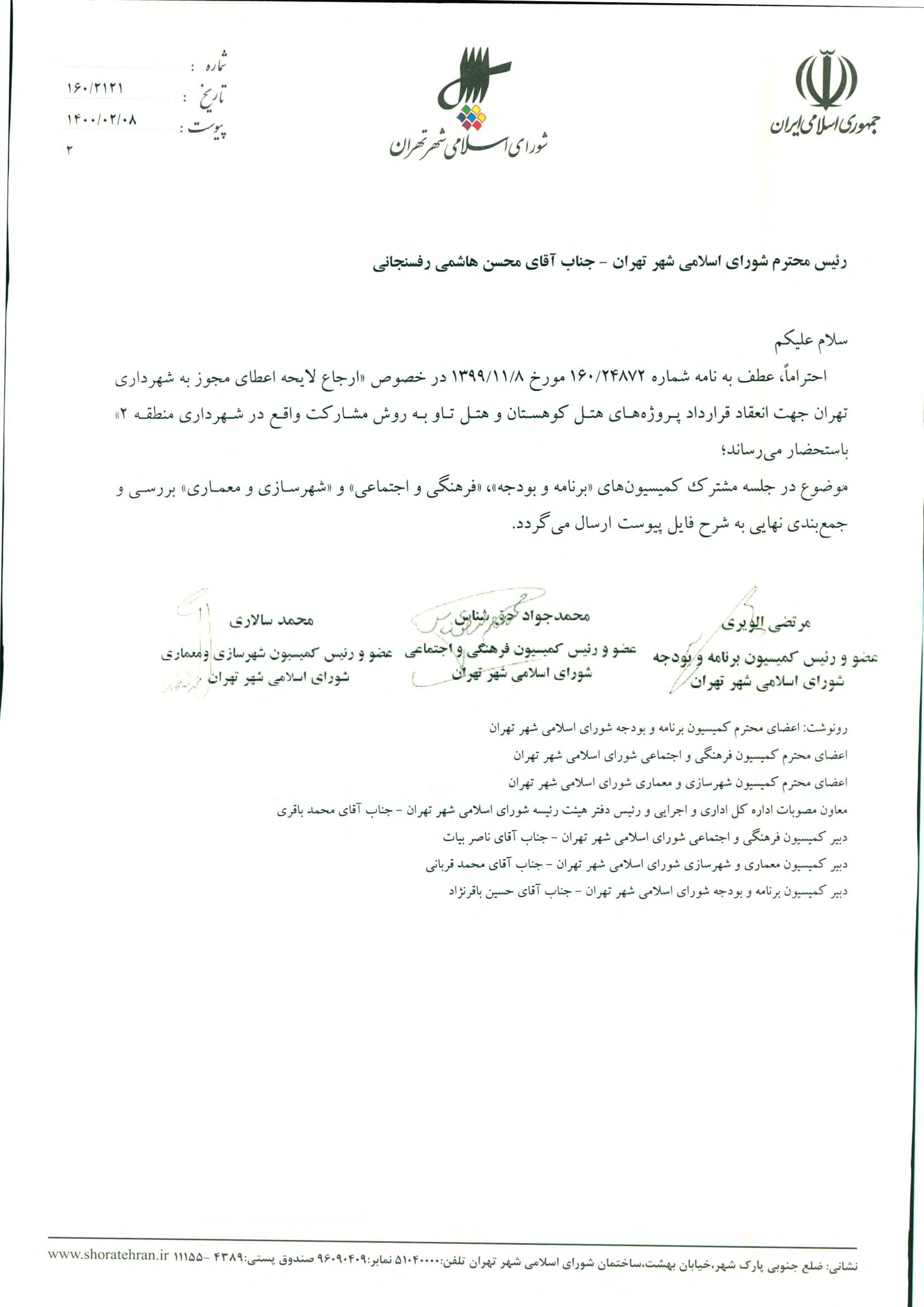 اعطاي مجوز به شهرداري تهران جهت انعقاد قرارداد پروژههاي هتل كوهستان و هتل تاو به روش مشاركت واقع در شهرداري منطقه 2