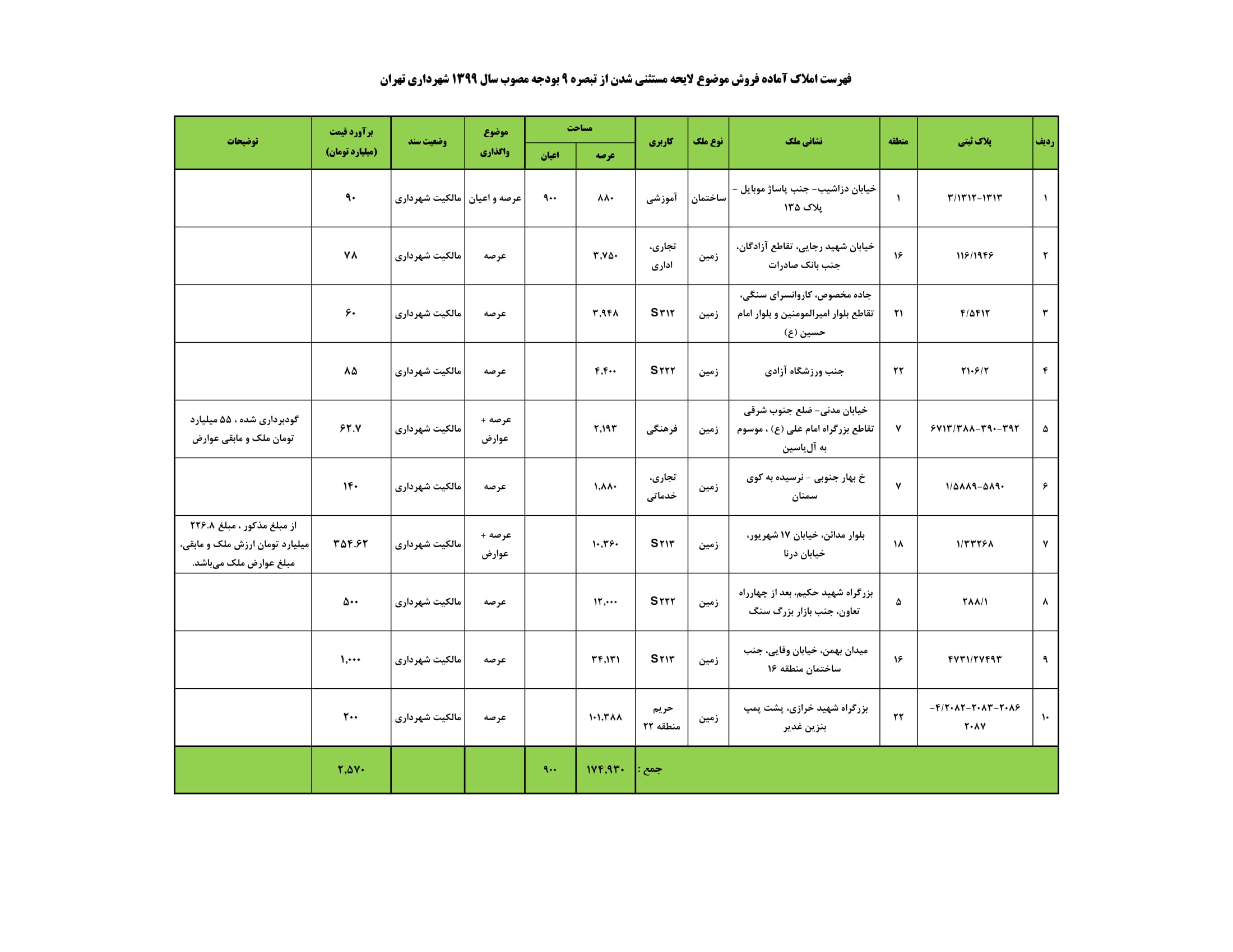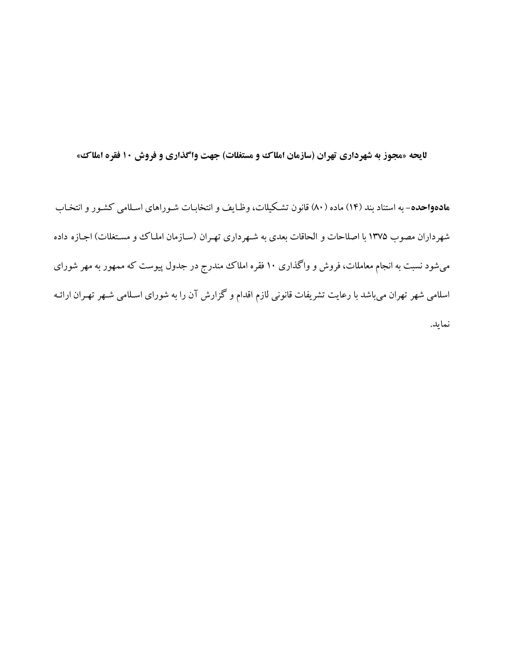 مجوز به شهرداري تهران (سازمان املاك و مستغلات) جهت واگذاري و فروش ده (10) فقره از املاك شهرداري تهران