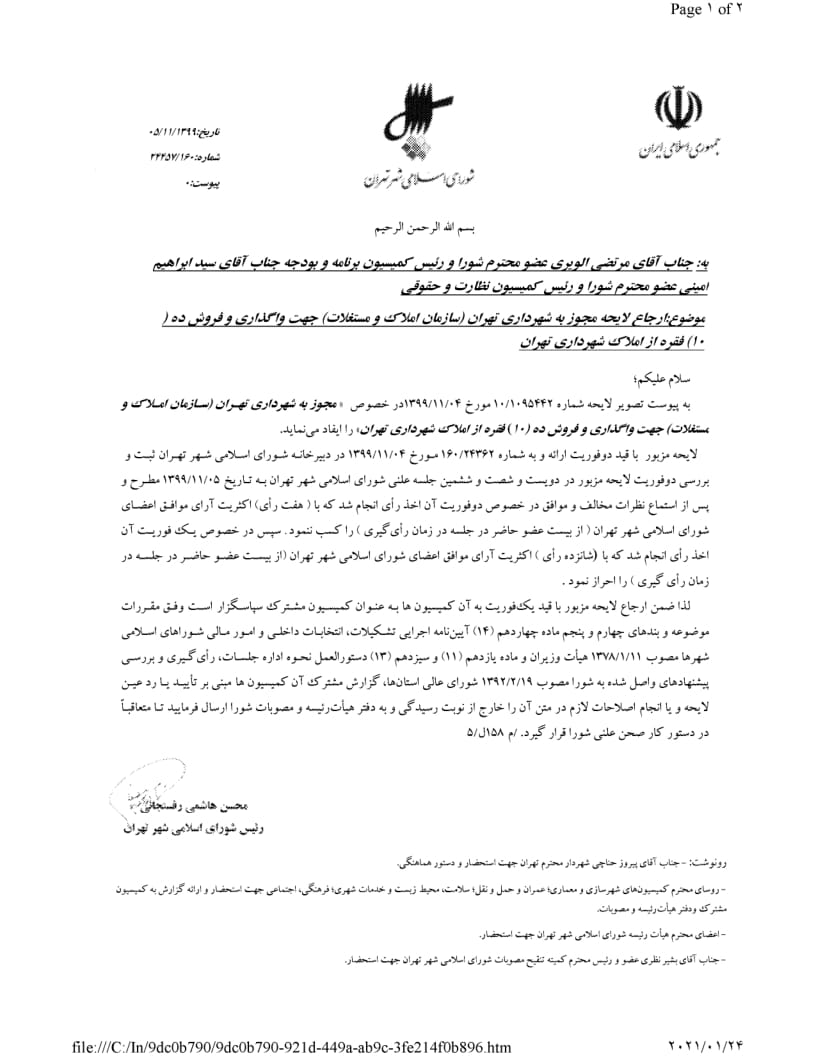 مجوز به شهرداري تهران (سازمان املاك و مستغلات) جهت واگذاري و فروش ده (10) فقره از املاك شهرداري تهران
