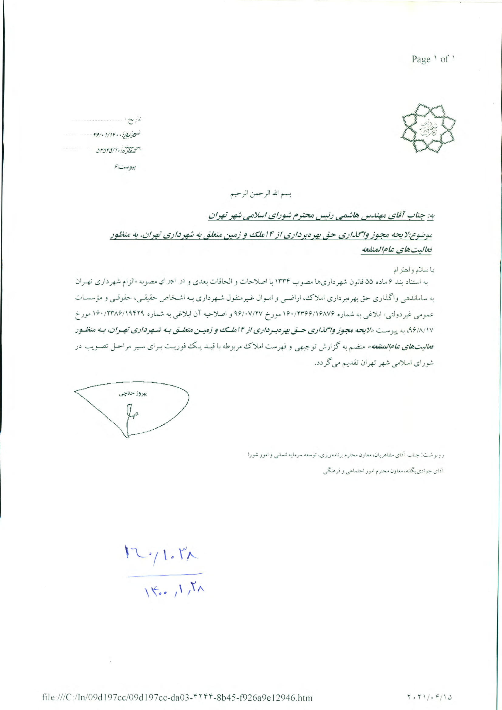 مجوز واگذاري حق بهرهبرداري از 14 ملك و زمين متعلق به شهرداري تهران به منظور فعاليتهاي عامالمنفعه