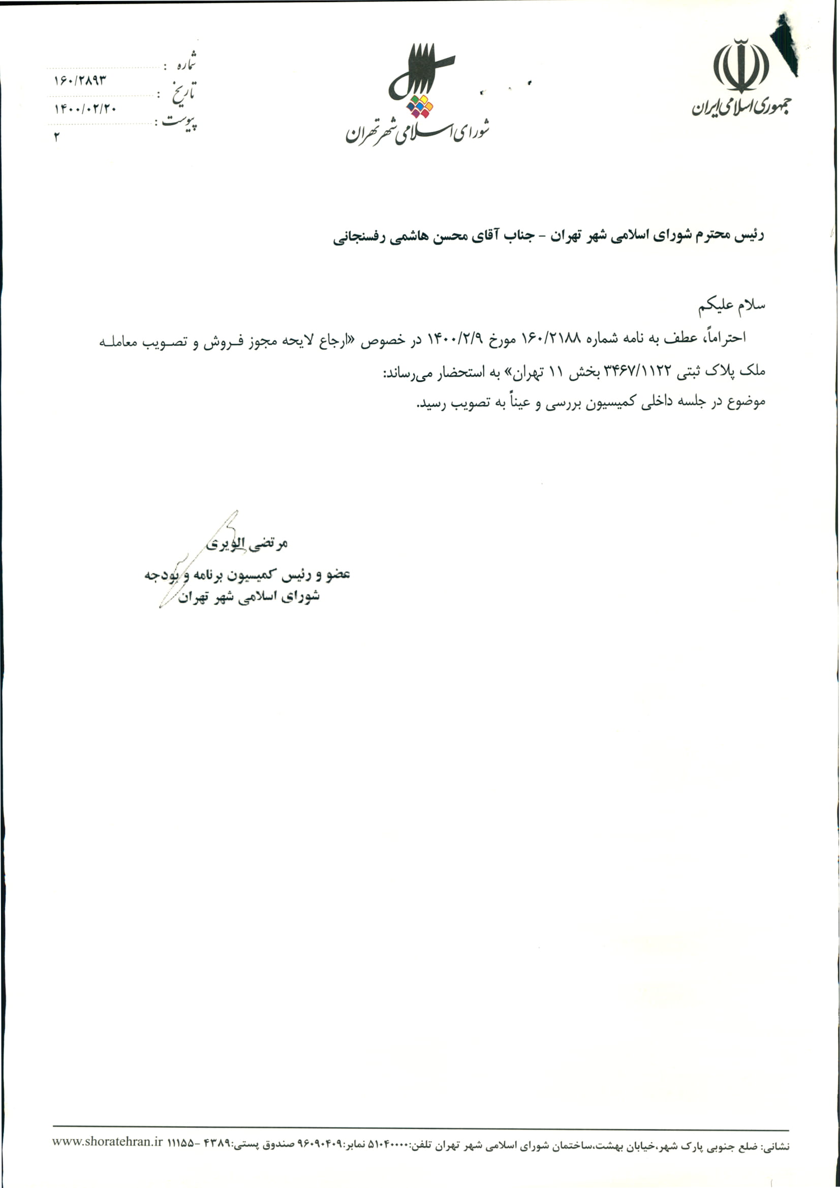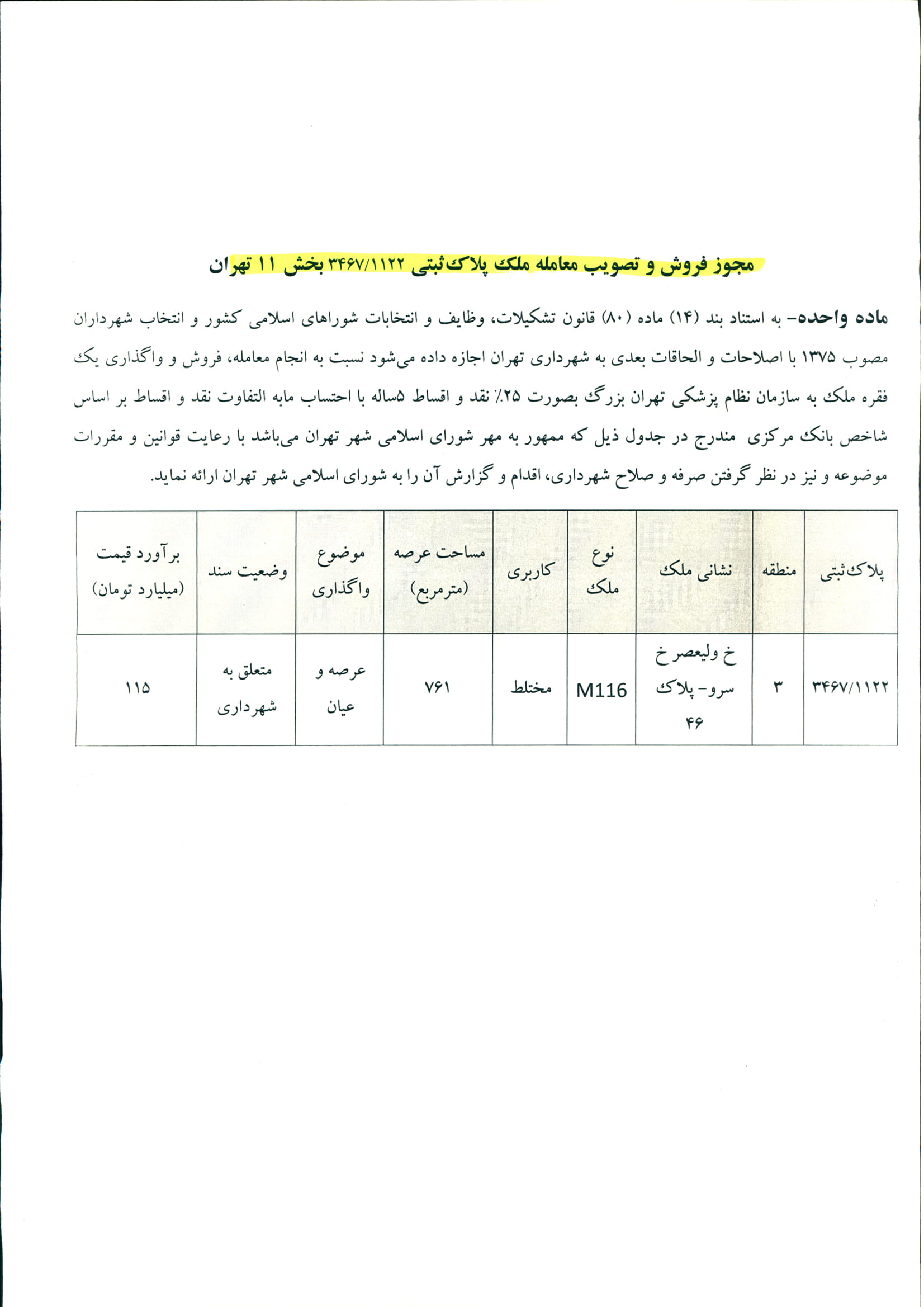 مجوز فروش و تصويب معامله ملك پلاك ثبتي 3467/1122 بخش 11 شهرداري تهران