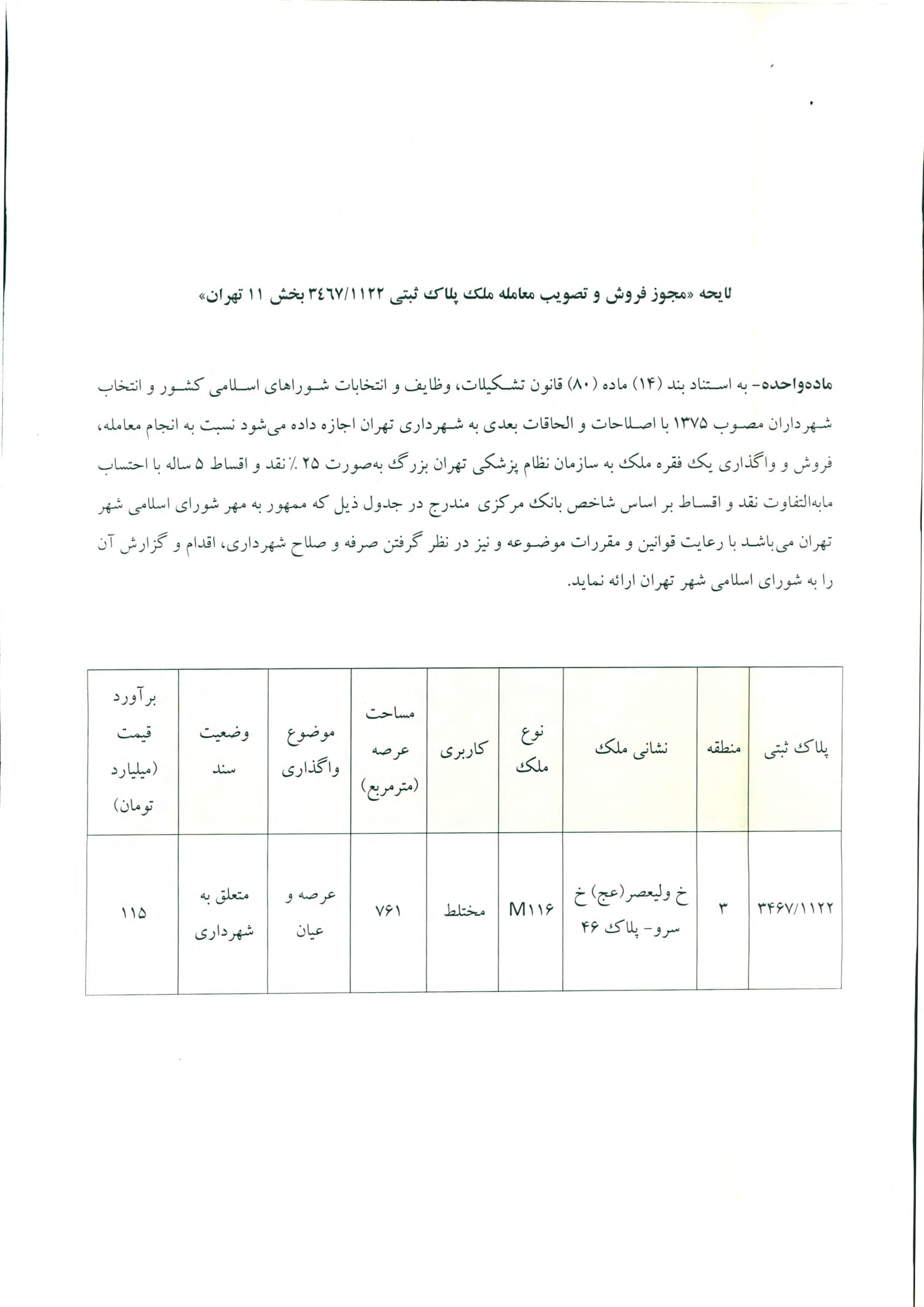 مجوز فروش و تصويب معامله ملك پلاك ثبتي 3467/1122 بخش 11 شهرداري تهران