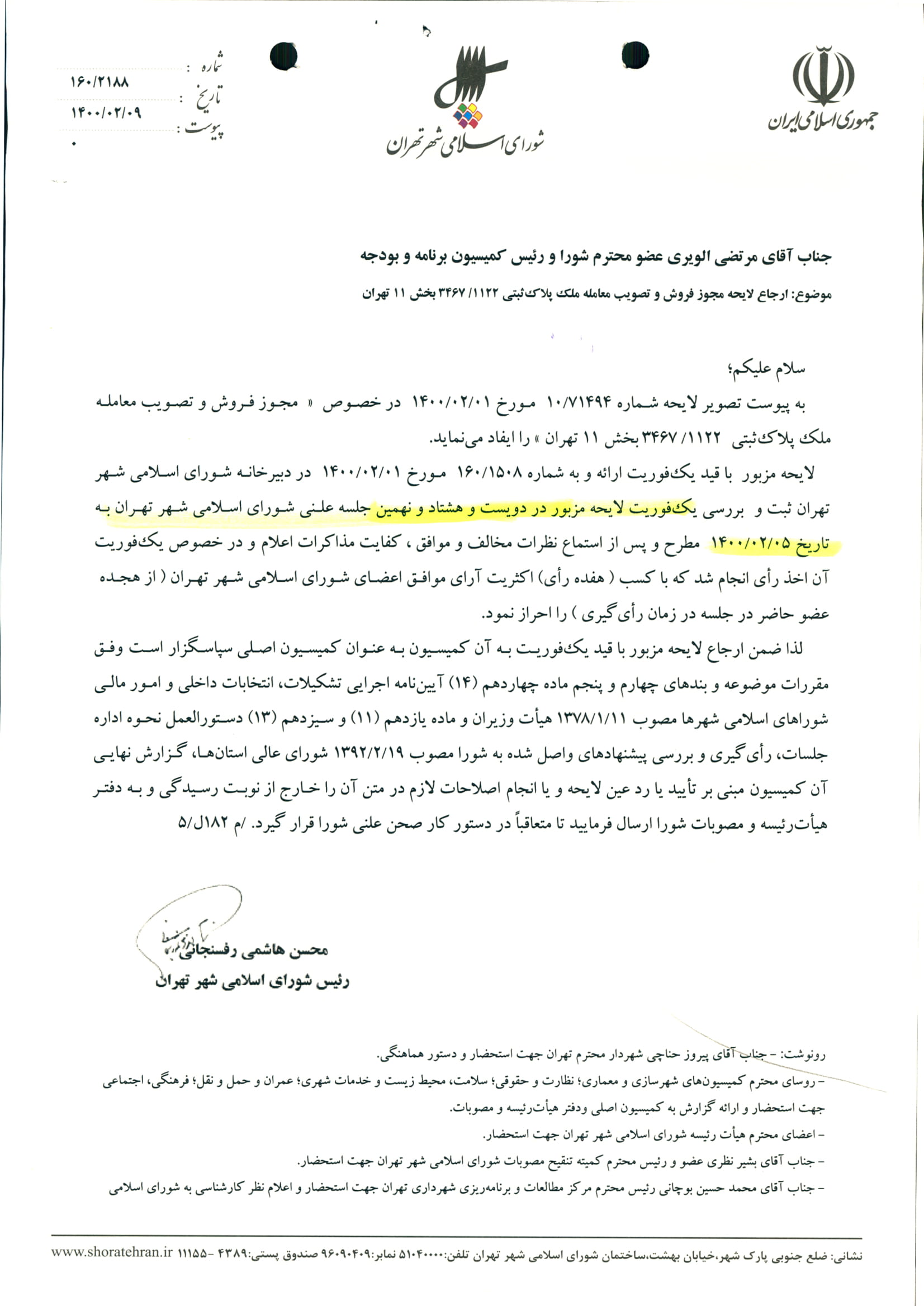 مجوز فروش و تصويب معامله ملك پلاك ثبتي 3467/1122 بخش 11 شهرداري تهران