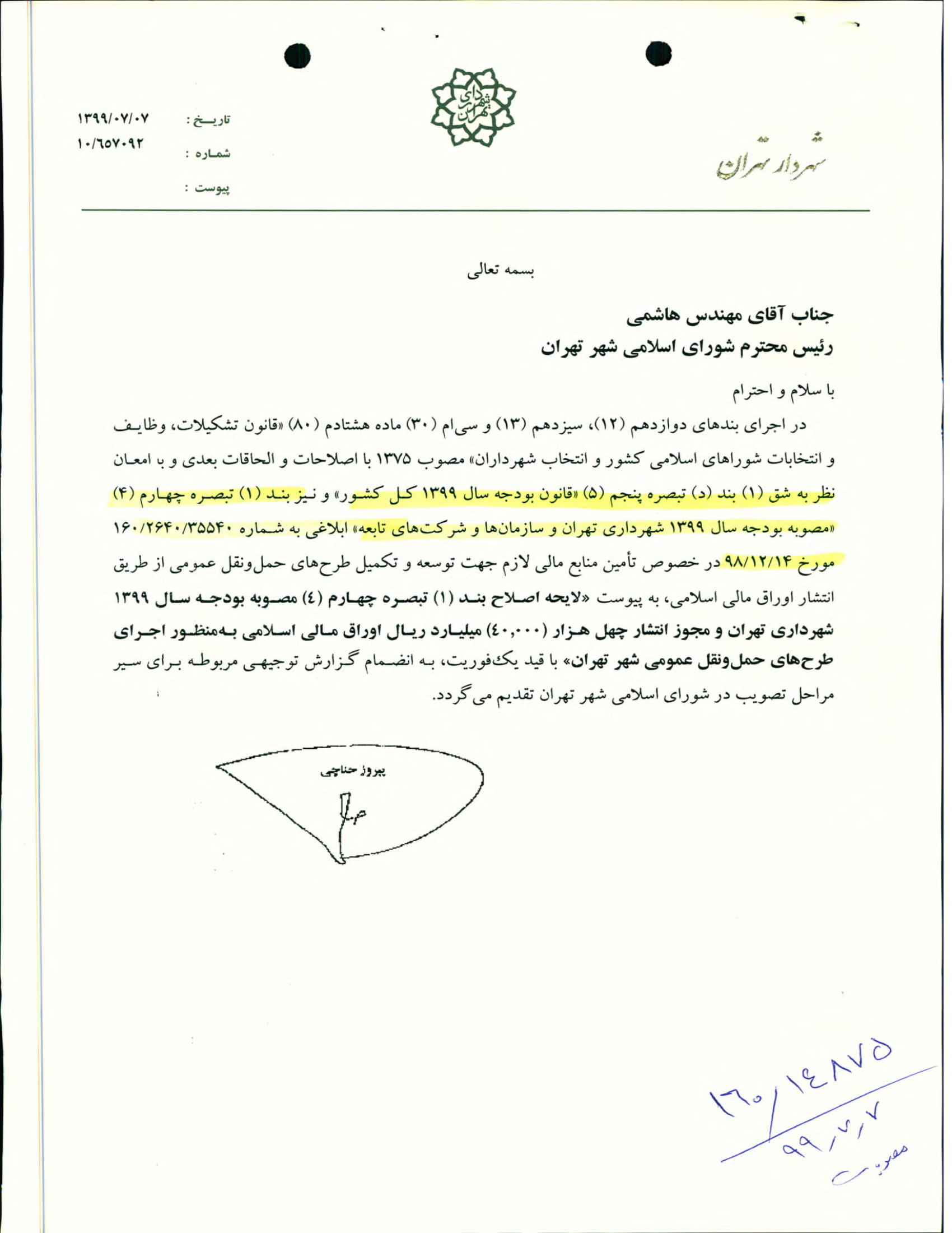 اصلاح بند (1) تبصره (4) مصوبه بودجه سال 1399 شهرداري تهران و مجوز انتشار چهل هزار (40,000) ميليارد ريال اوراق مالي اسلامي به منظور اجراي طرحهاي حمل و نقل عمومي شهر تهران