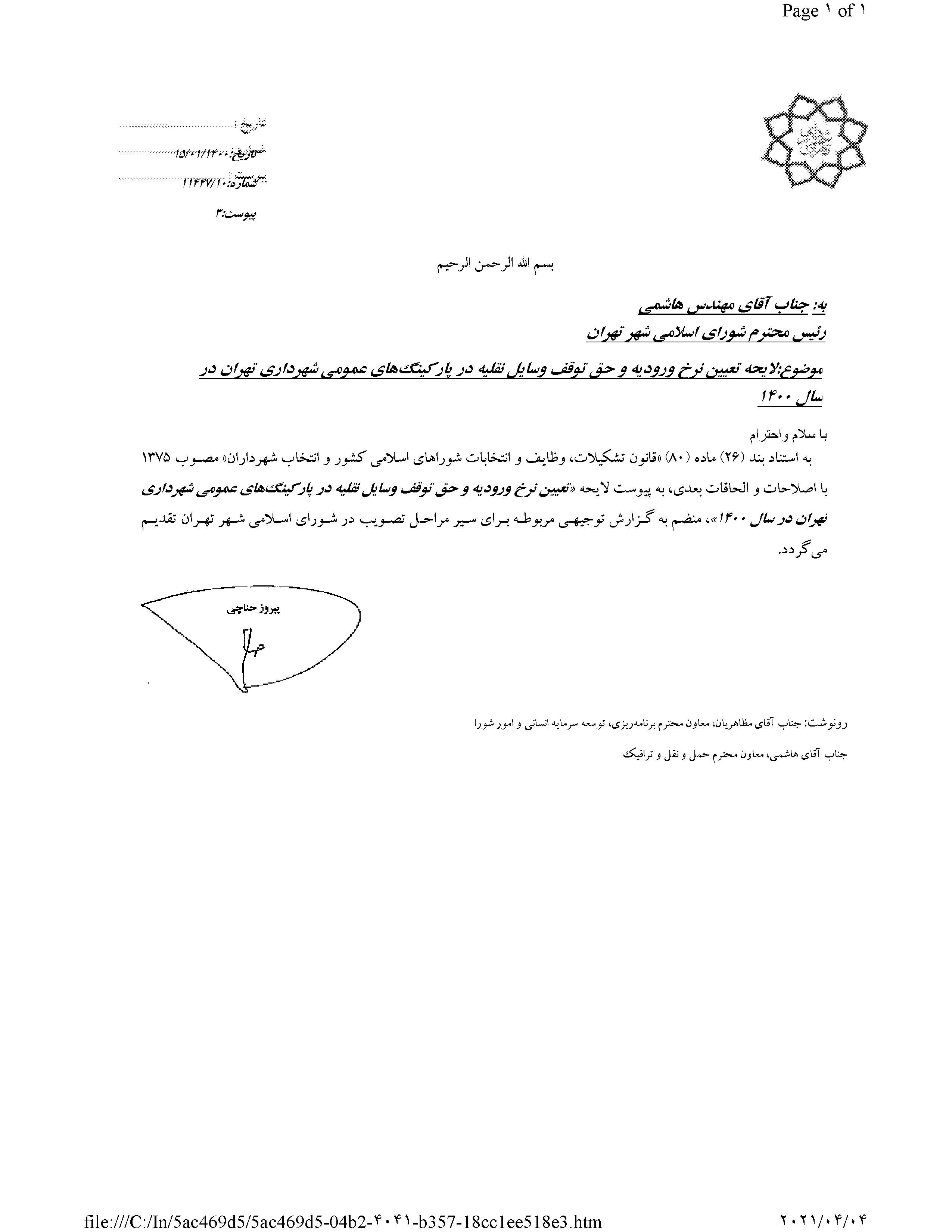 تعيين نرخ وروديه و حق توقف وسايل نقليه در پاركينگهاي عمومي شهرداري تهران در سال 1400