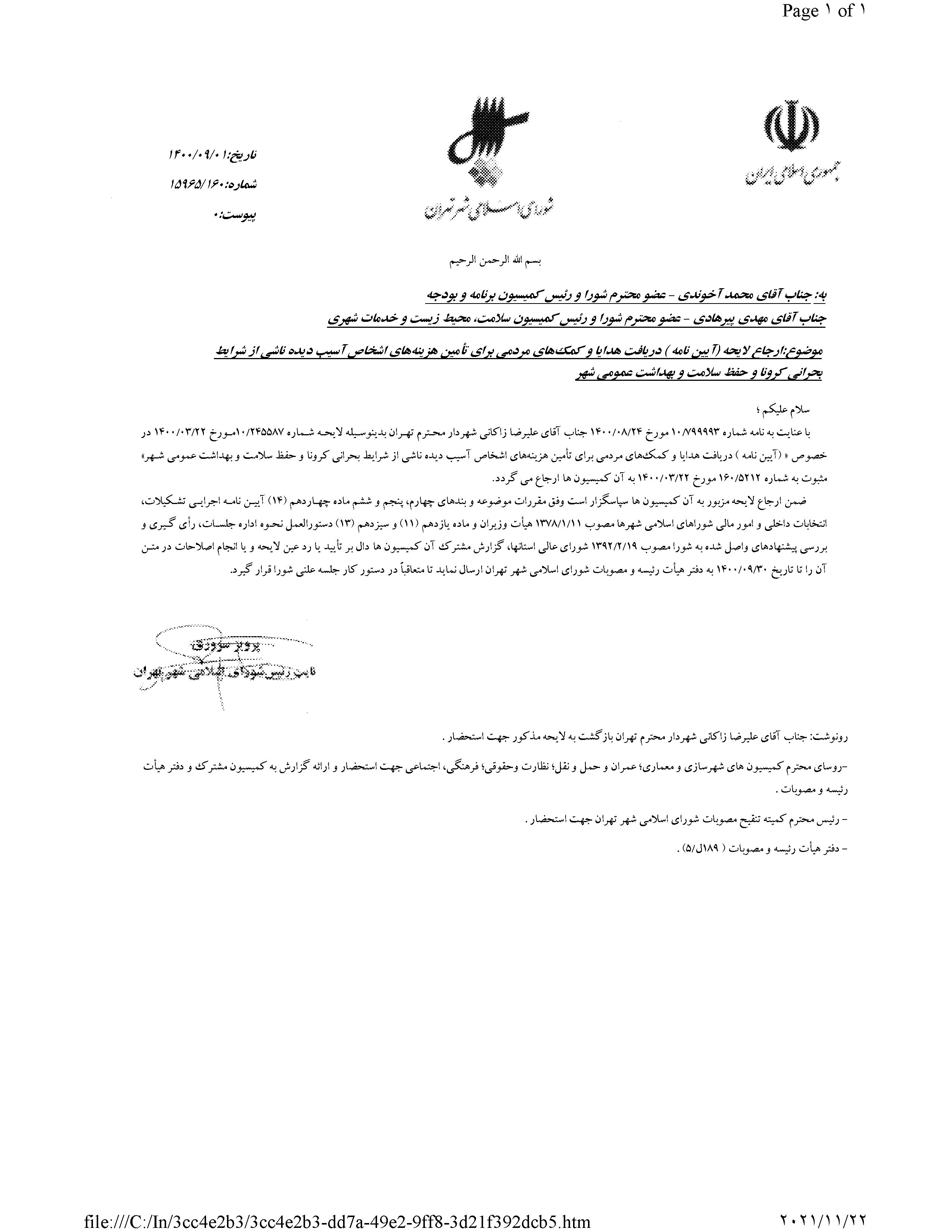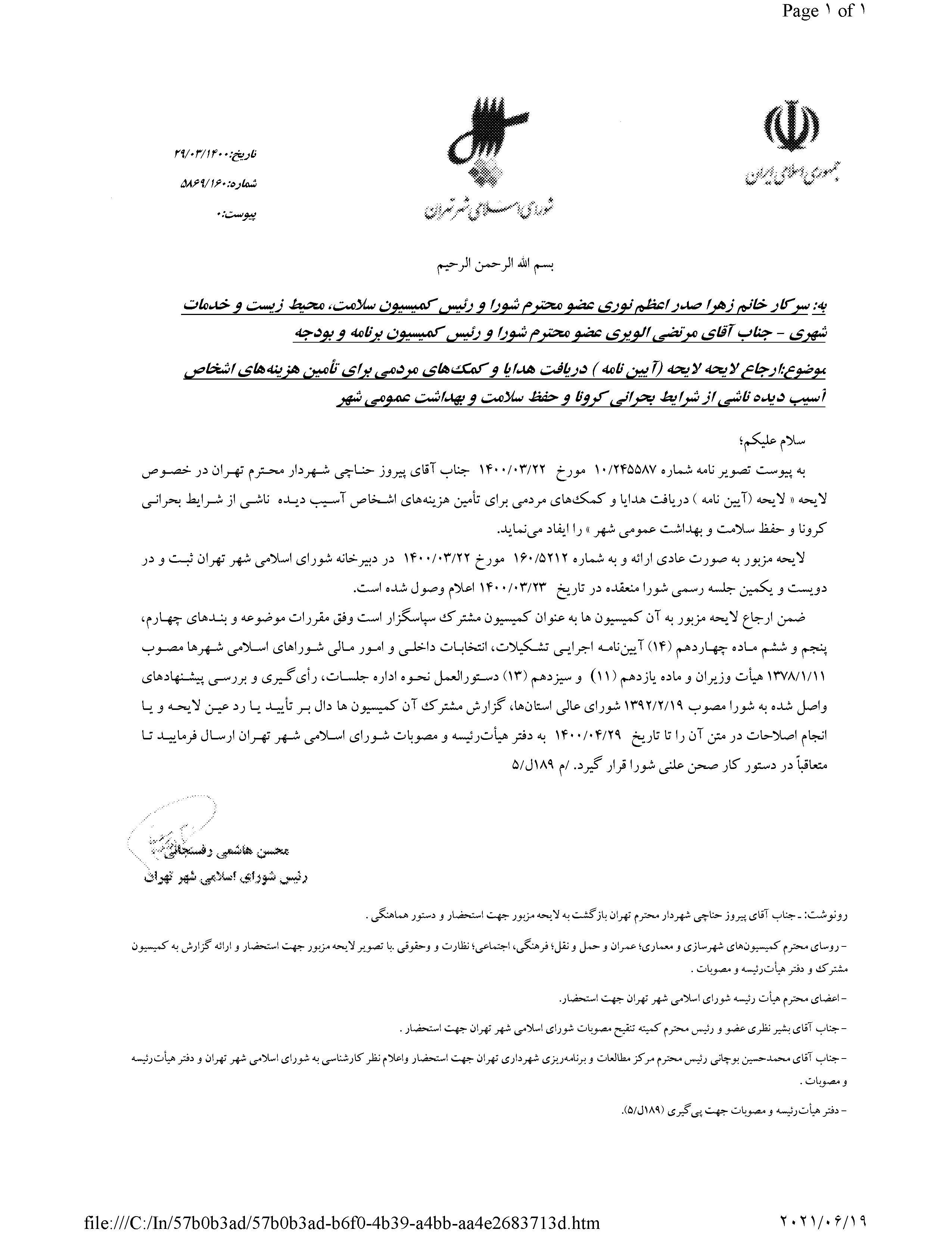 آييننامه «دريافت هدايا و كمكهاي مردمي براي تأمين هزينههاي اشخاص آسيبديده ناشي از شرايط بحراني كرونا و حفظ سلامت و بهداشت عمومي شهر»