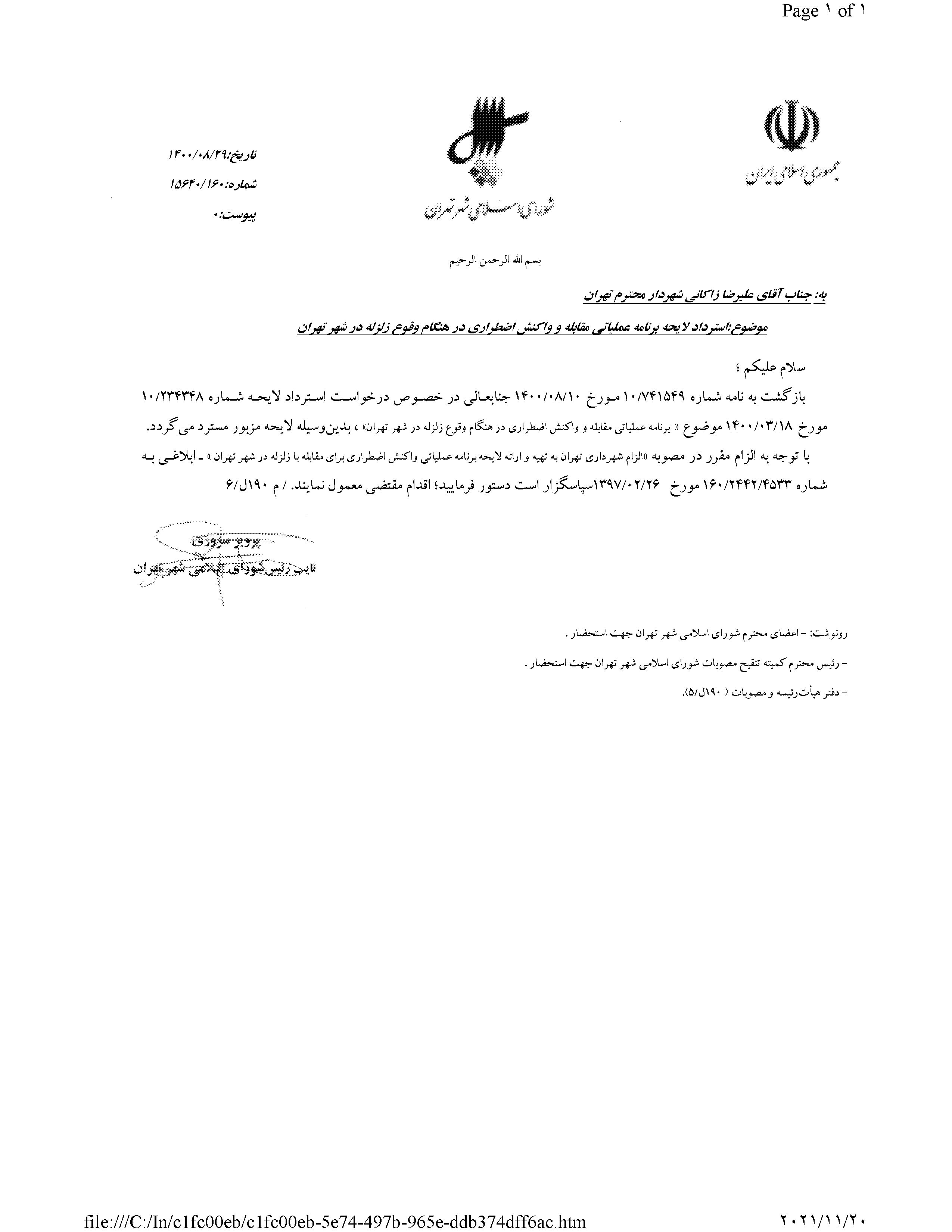 برنامه عملياتي مقابله و واكنش اضطراي در هنگام وقوع زلزله در شهر تهران