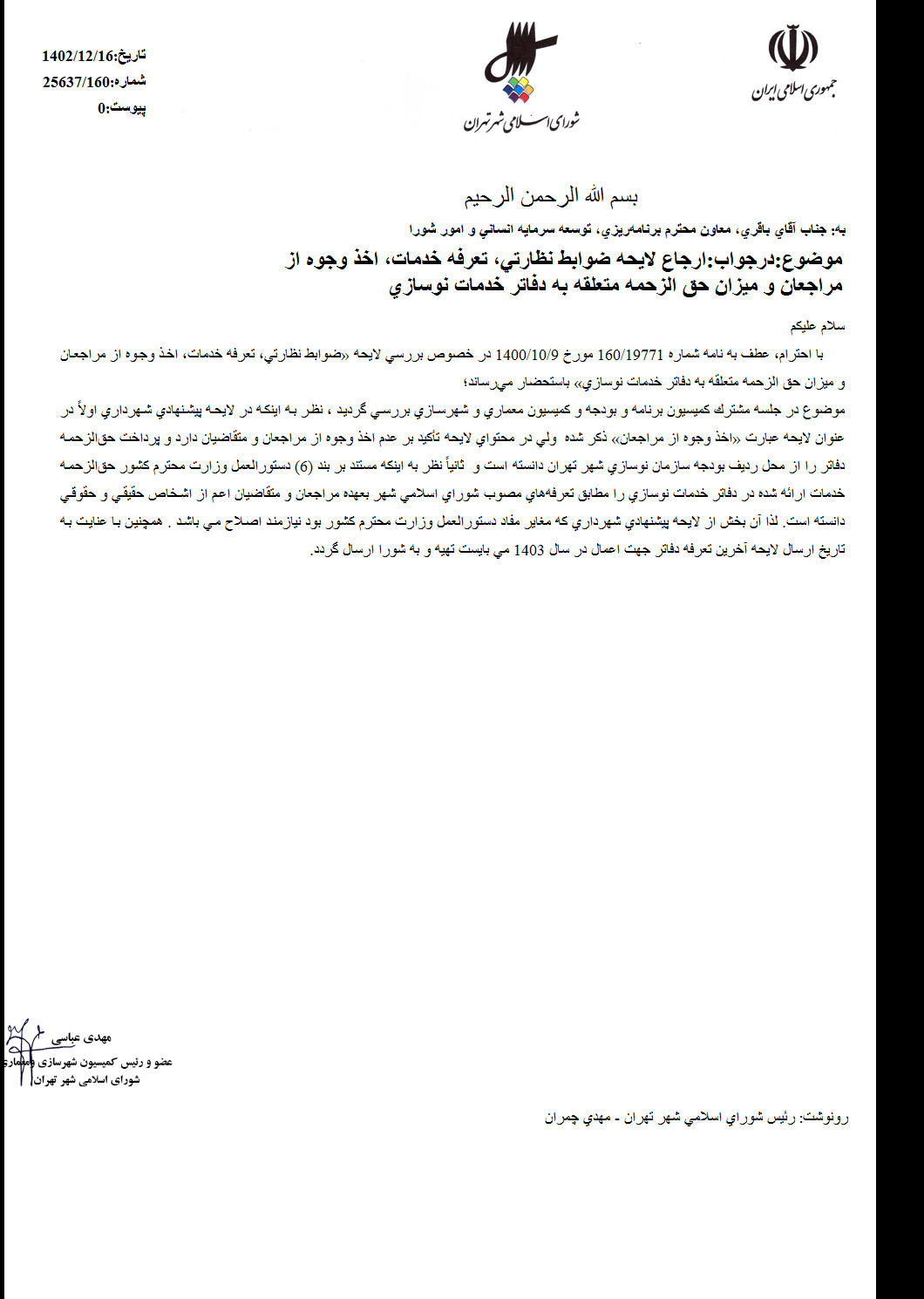 ضوابط نظارتي، تعرفه خدمات، اخذ وجوه از مراجعان و ميزان حقالزحمه متعلقه به دفاتر خدمات نوسازي