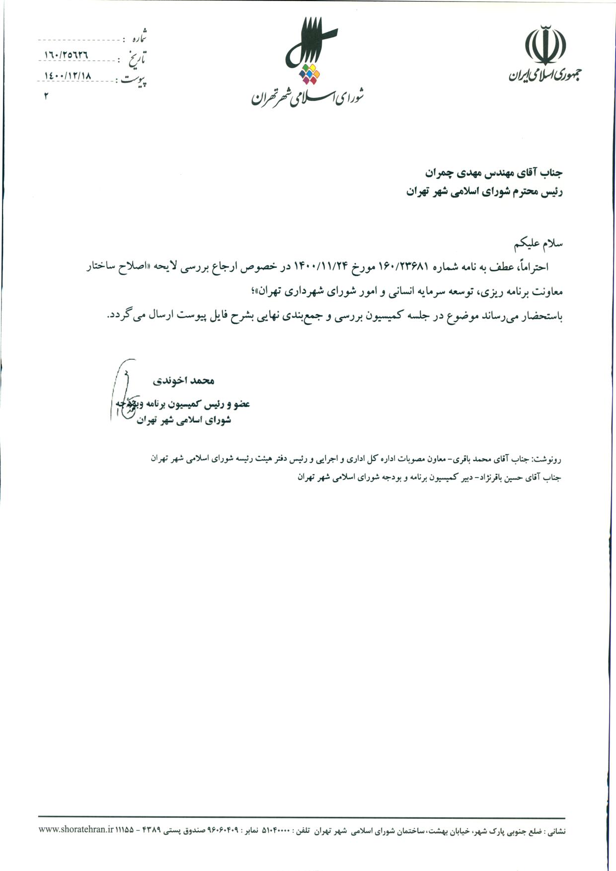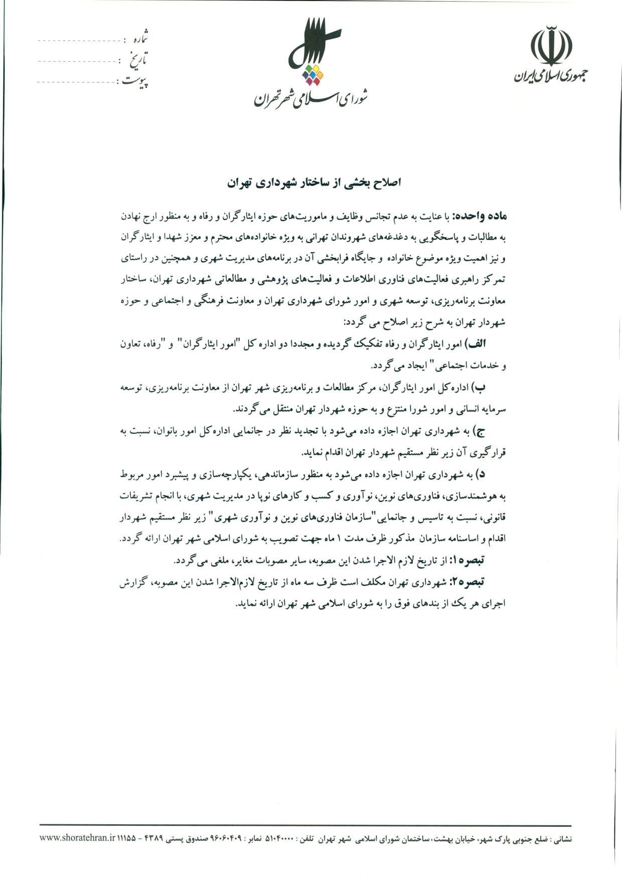 اصلاح ساختار معاونت برنامهريزي، توسعه سرمايه انساني و امور شوراي شهرداري تهران