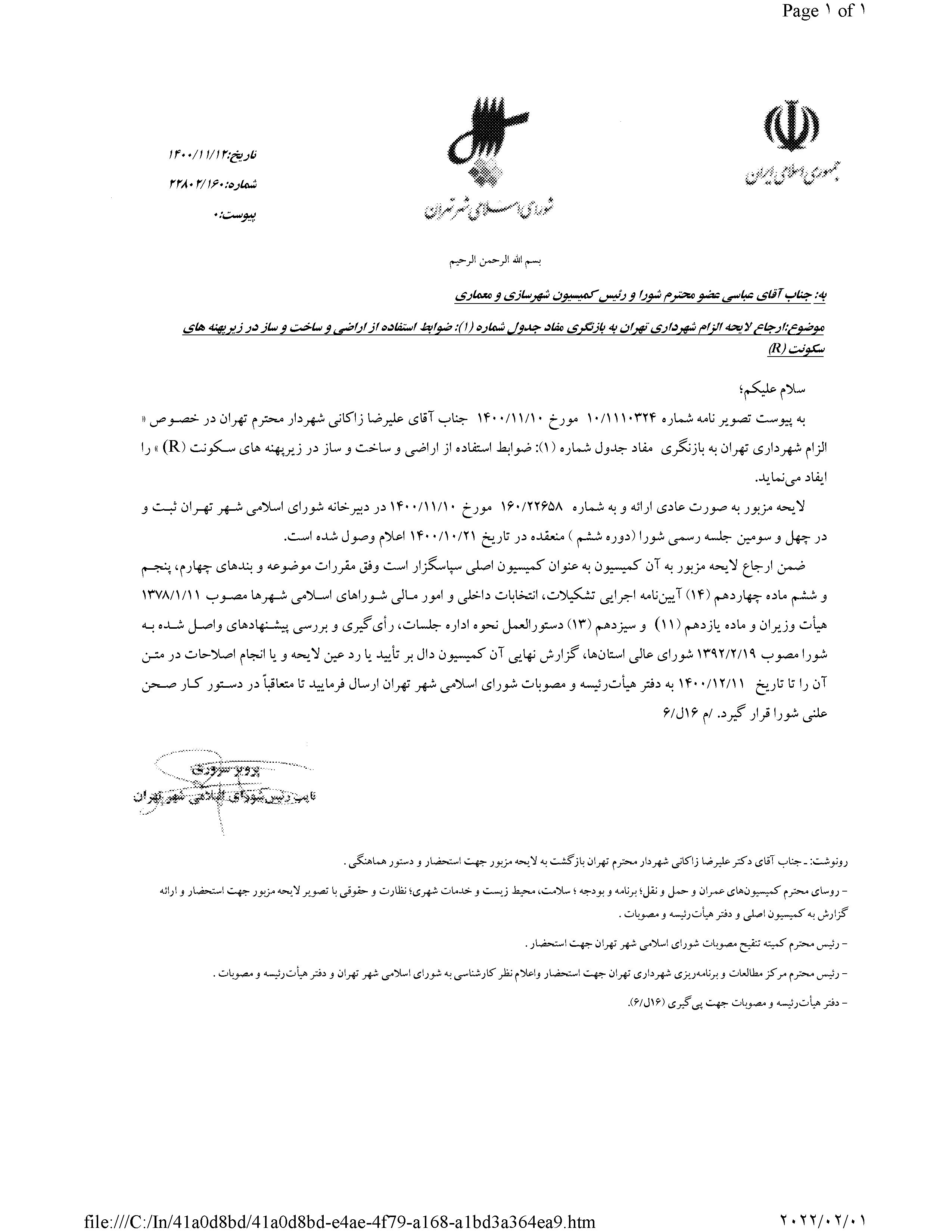 الزام شهرداري تهران به بازنگري مفاد جدول شماره (1): ضوابط استفاده از اراضي و ساختوساز در زيرپهنههاي سكونت (R)