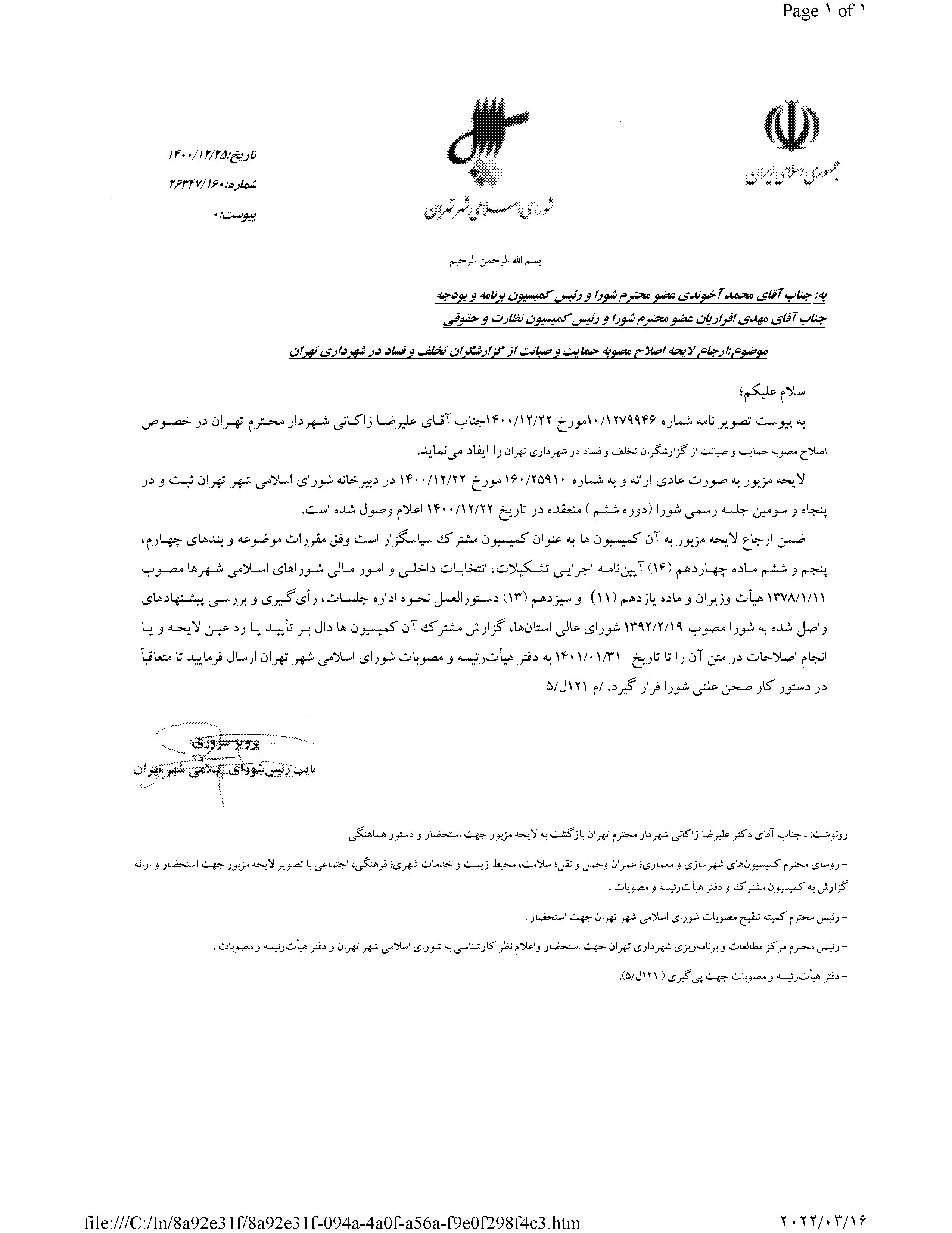 اصلاح مصوبه حمايت و صيانت از گزارشگران تخلف و فساد در شهرداري تهران