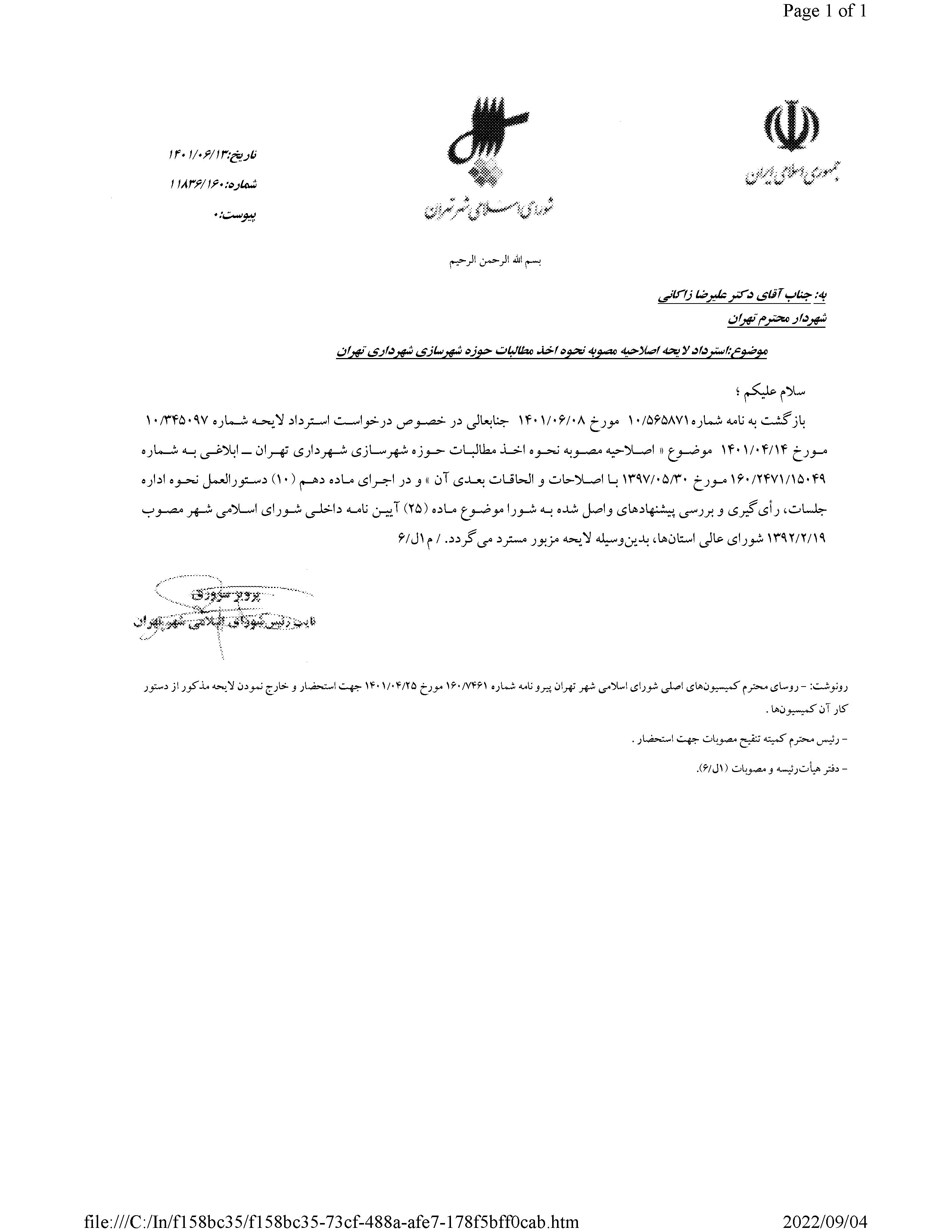 اصلاحيه مصوبه «نحوه اخذ مطالبات حوزه شهرسازي شهرداري تهران» - ابلاغي به شماره 160/2471/15049 مورخ 1397/05/30 با اصلاحات و الحاقات بعدي آن