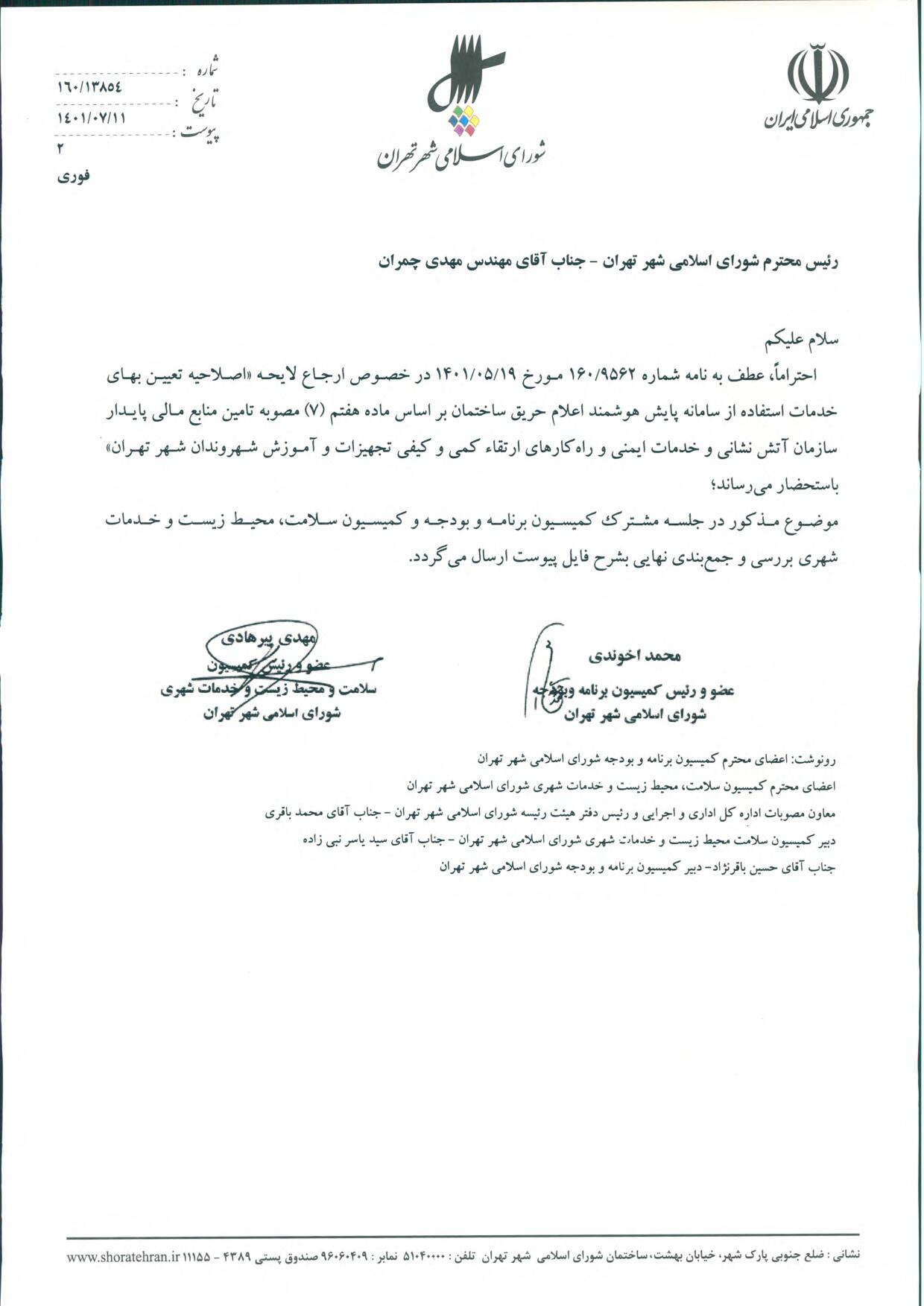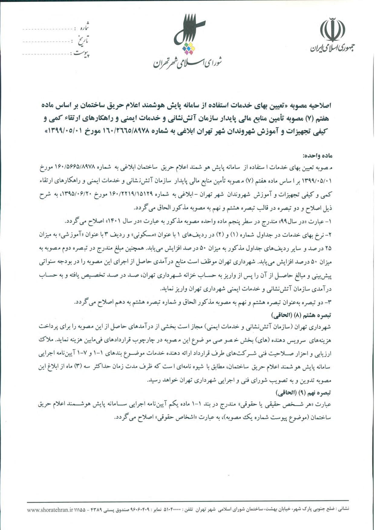 اصلاحيه تعيين بهاي خدمات استفاده از سامانه پايش هوشمند اعلام حريق ساختمان بر اساس ماده هفتم (7) مصوبه تأمين منابع مالي پايدار سازمان آتشنشاني و خدمات ايمني و راهكارهاي ارتقاء كمي و كيفي تجهيزات و آموزش شهروندان