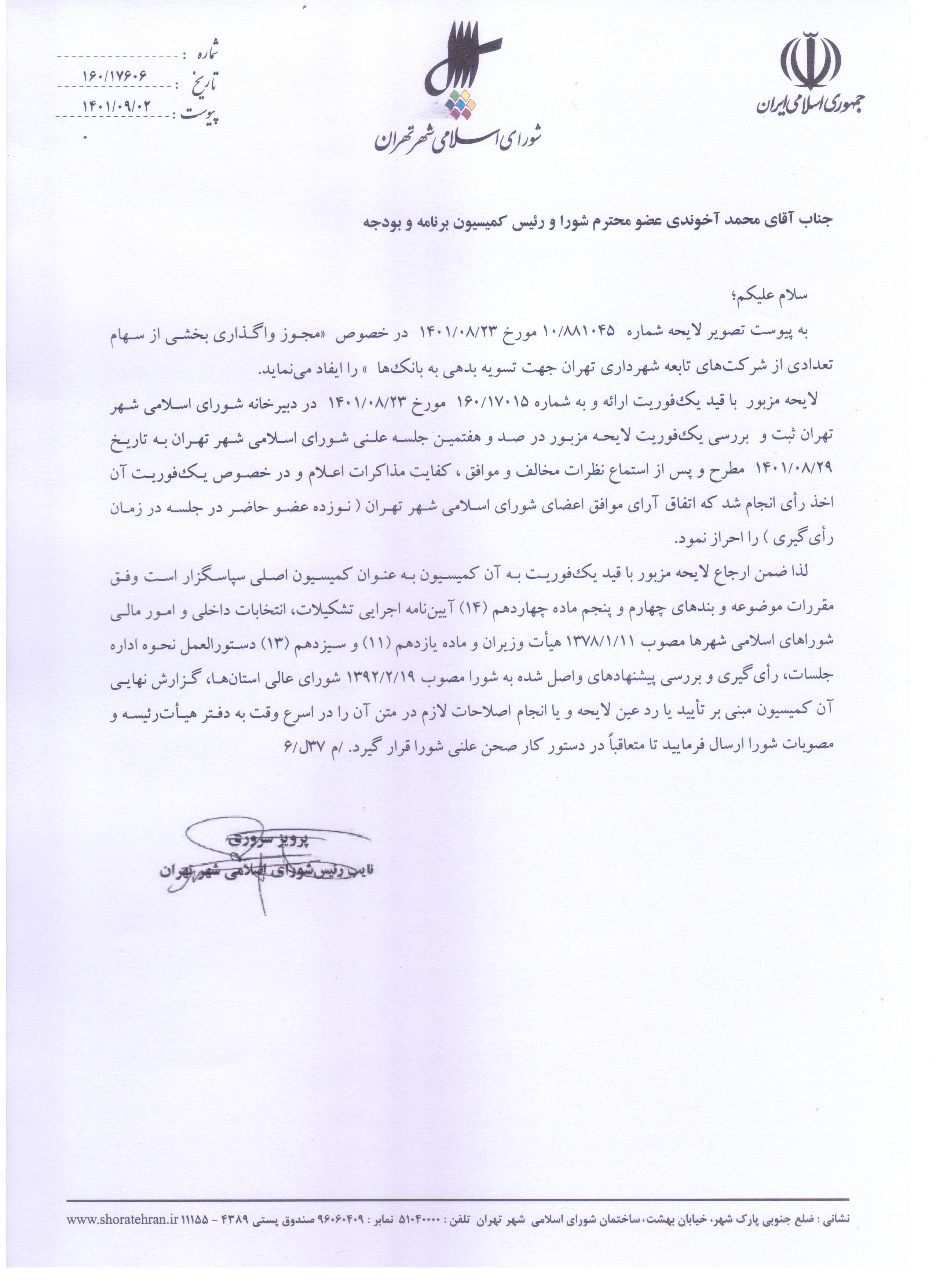 مجوز واگذاري بخشي از سهام تعدادي از شركتهاي تابعه شهرداري تهران جهت تسويه بدهي به بانكها