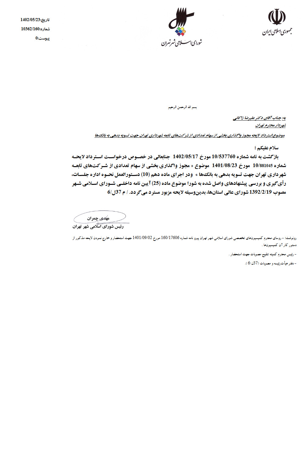 مجوز واگذاري بخشي از سهام تعدادي از شركت‌هاي تابعه شهرداري تهران جهت تسويه بدهي به بانك‌ها