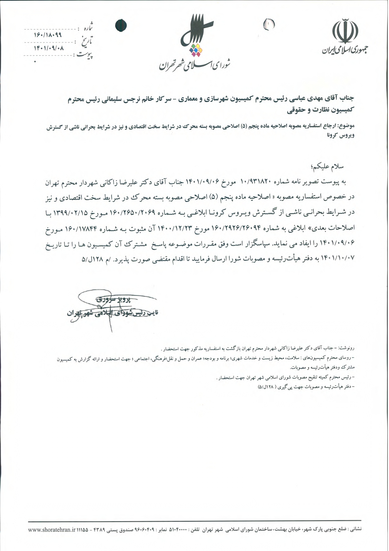استفساريه مصوبه «اصلاحيه ماده پنجم (5) اصلاحي مصوبه بسته محرك در شرايط سخت اقتصادي و نيز در شرايط بحراني ناشي از گسترش ويروس كرونا ابلاغي به شماره 160/2650/2069 مورخ 1399/02/15 با اصلاحات بعدي» ابلاغي به شماره 160/2926/26094