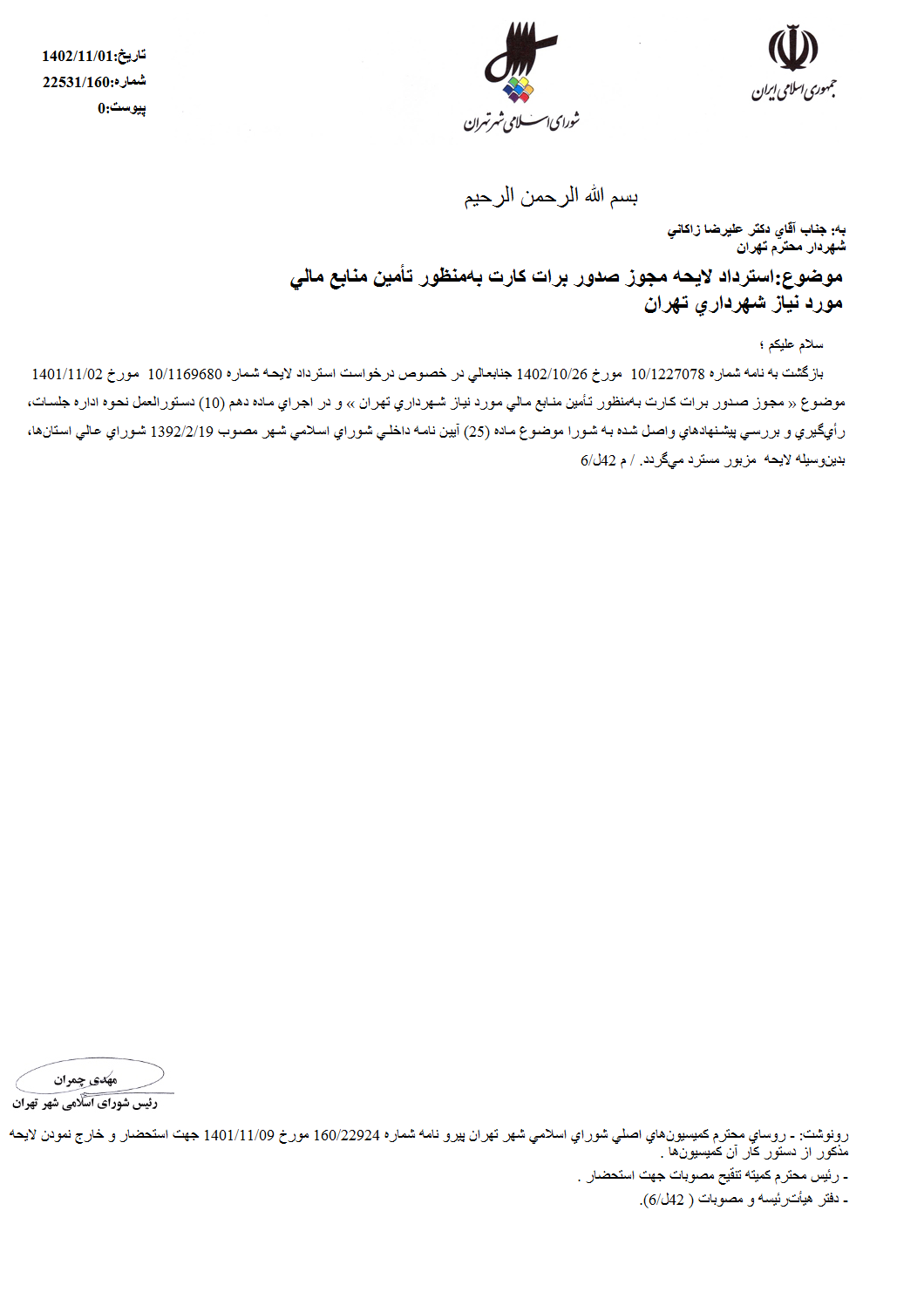 مجوز صدور برات كارت به منظور تأمين منابع مالي مورد نياز شهرداري تهران