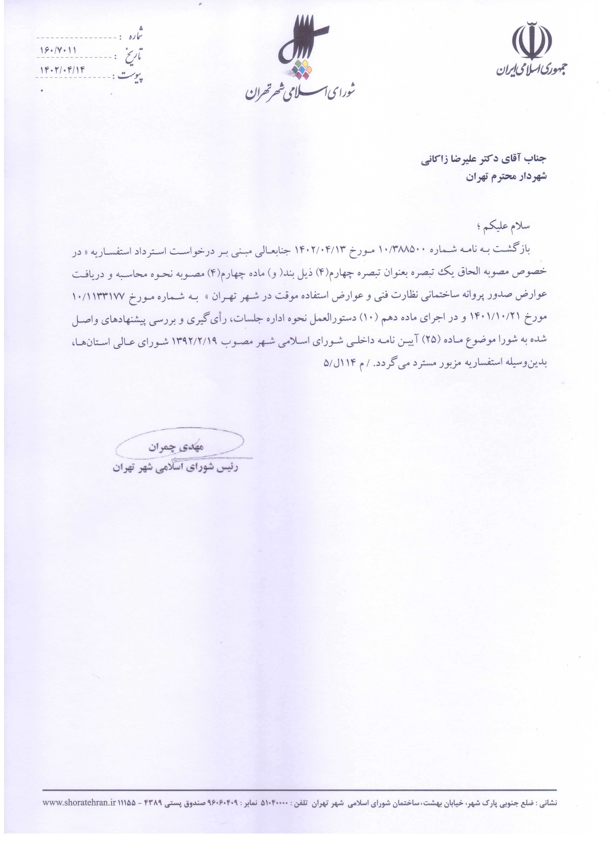 استفساريه مصوبه «الحاق يك تبصره به عنوان تبصره چهارم (4) ذيل بند (و) ماده چهارم (4) مصوبه «نحوه محاسبه و دريافت عوارض صدور پروانه ساختماني، نظارت فني و عوارض استفاده موقت در شهر تهران» - ابلاغي به شماره 160/2624/32265 مورخ 98/11/14» ابلاغي به شماره 160/2731/25341 مورخ 1399/11/13