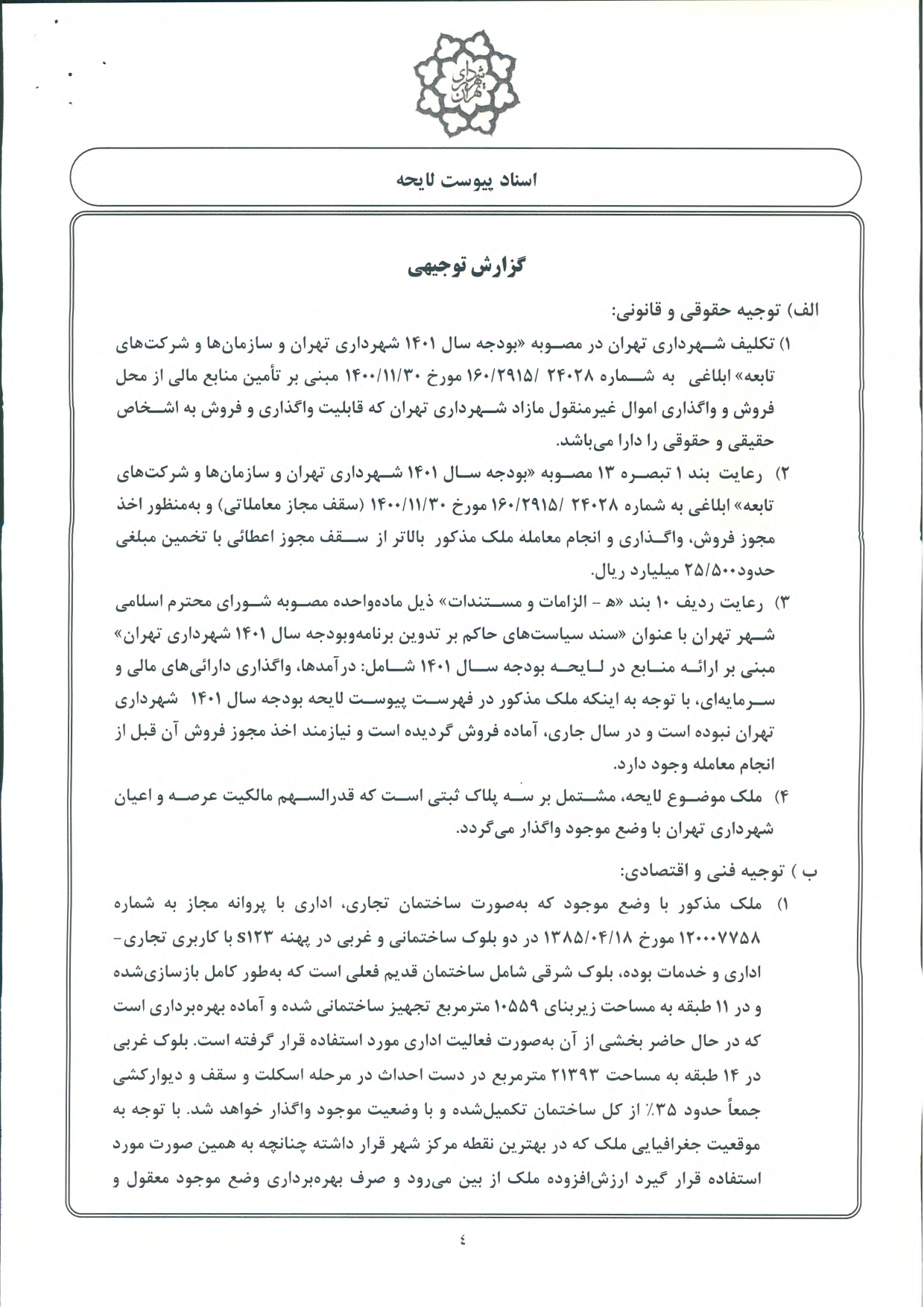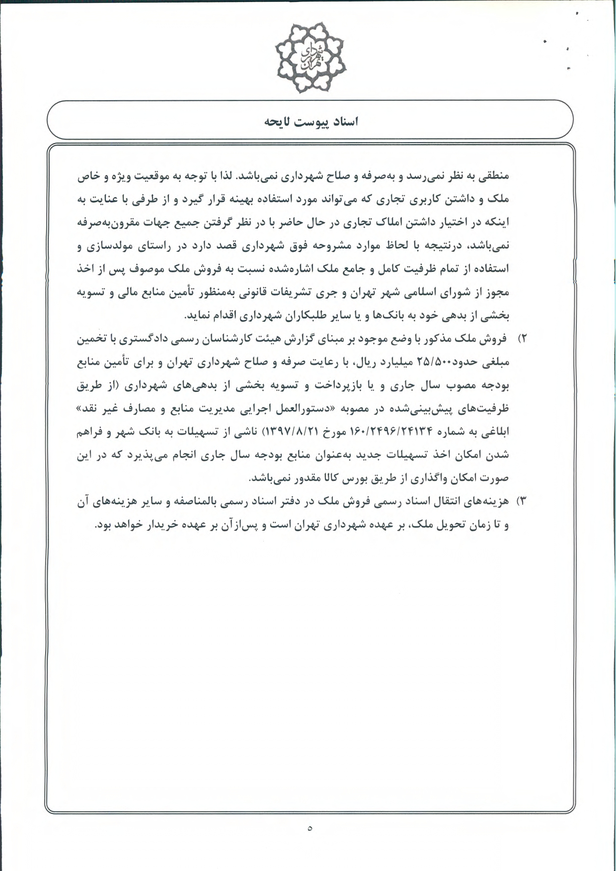 مجوز فروش، واگذاري و انجام معامله ملك متعلق به شهرداري تهران (با كد نوسازي 12204010)