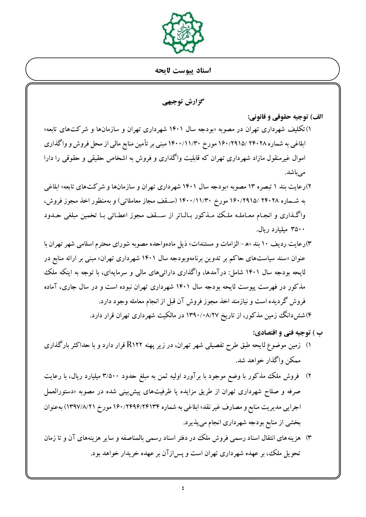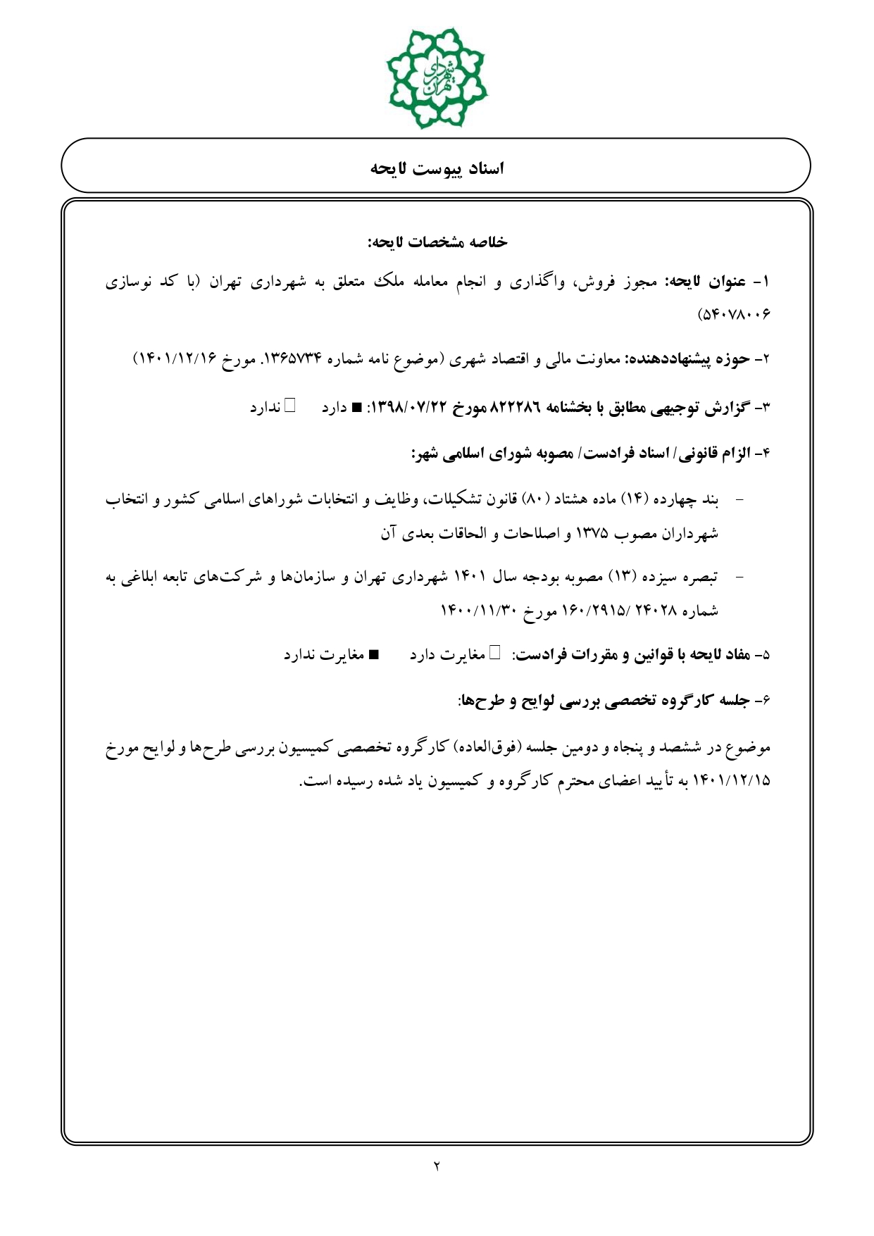 مجوز فروش، واگذاري و انجام معامله ملك متعلق به شهرداري تهران (با كد نوسازي 54078006)