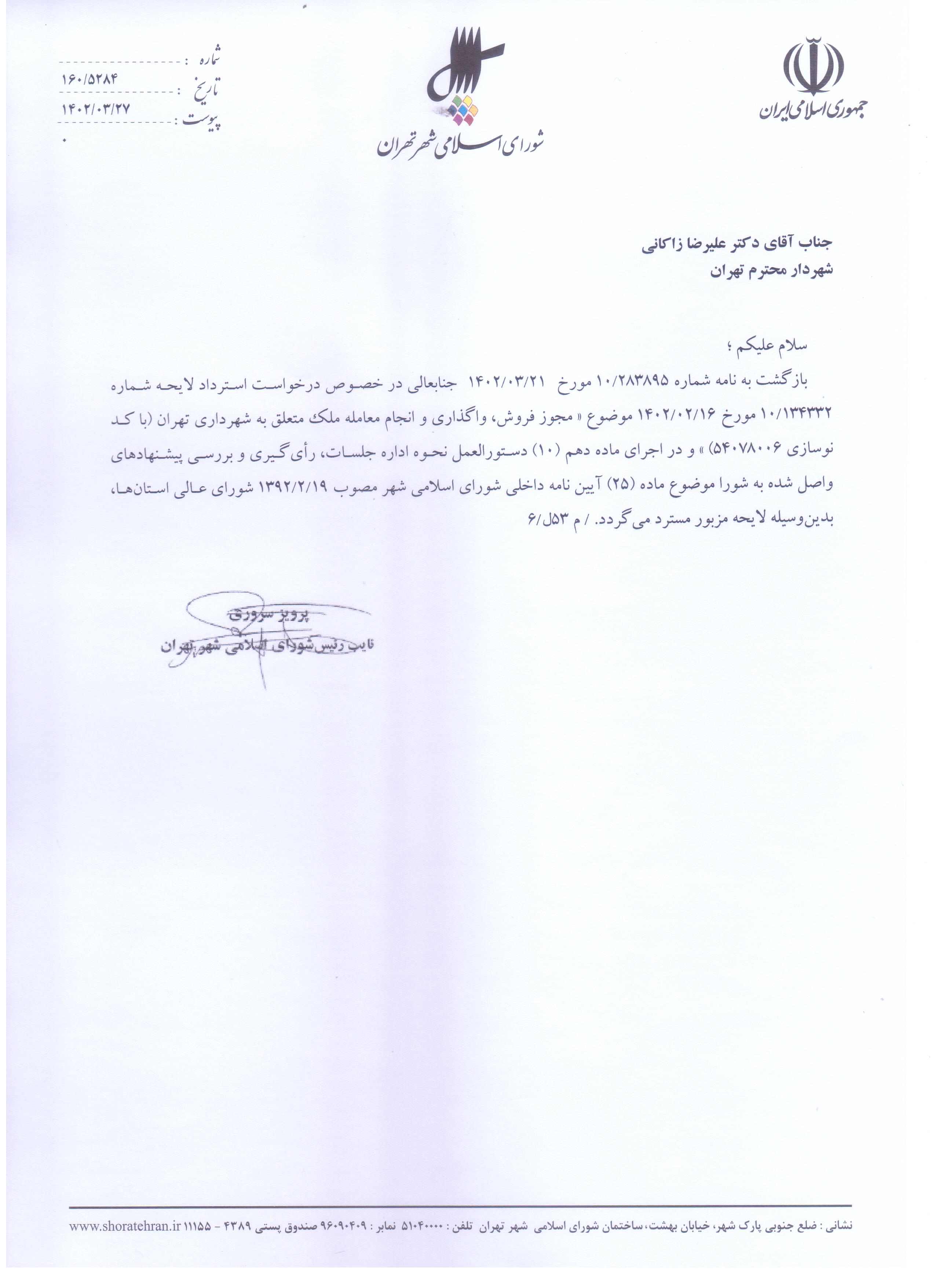 مجوز فروش، واگذاري و انجام معامله ملك متعلق به شهرداري تهران (با كد نوسازي 54078006)
