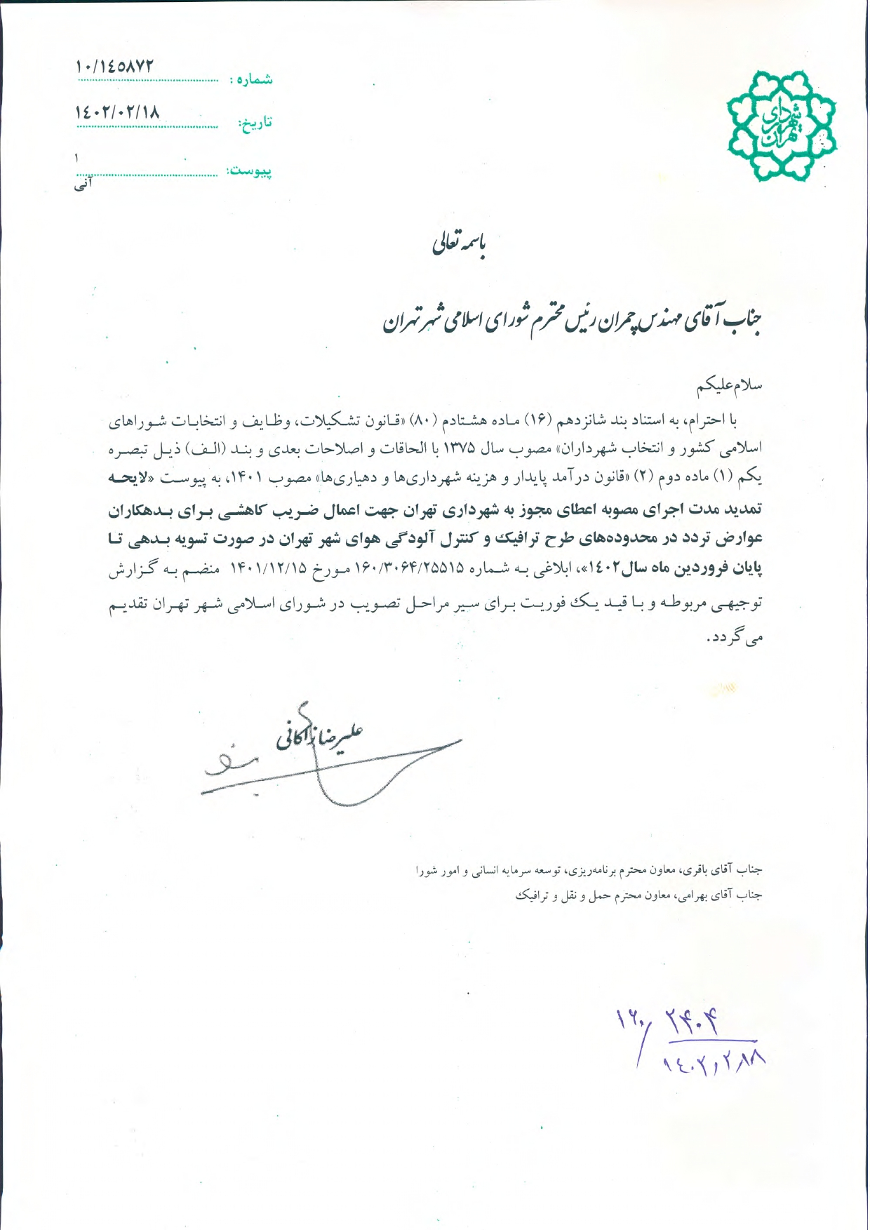 تمديد مدت اجراي مصوبه «اعطاي مجوز به شهرداري تهران جهت اعمال ضريب كاهش براي بدهكاران عوارض تردد در محدودههاي طرح ترافيك و كنترل آلودگي هواي شهر تهران در صورت تسويه بدهي تا پايان فروردين ماه سال 1402»- ابلاغي به شماره 160/3064/2515 مورخ 1401/12/15